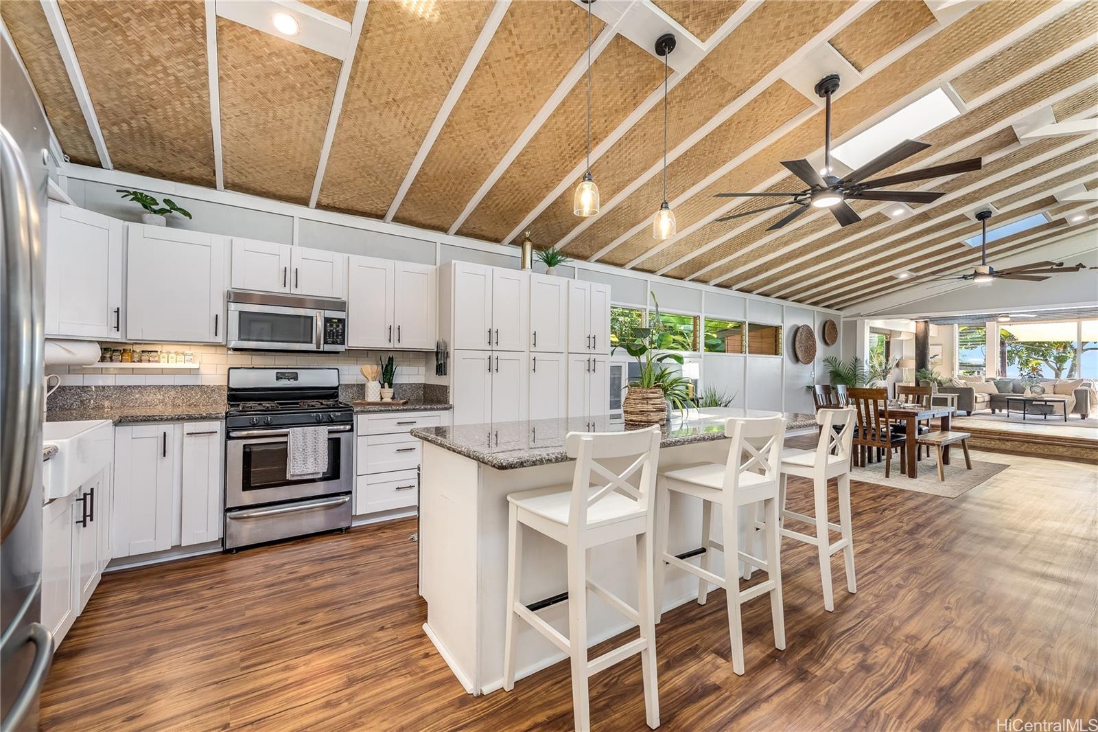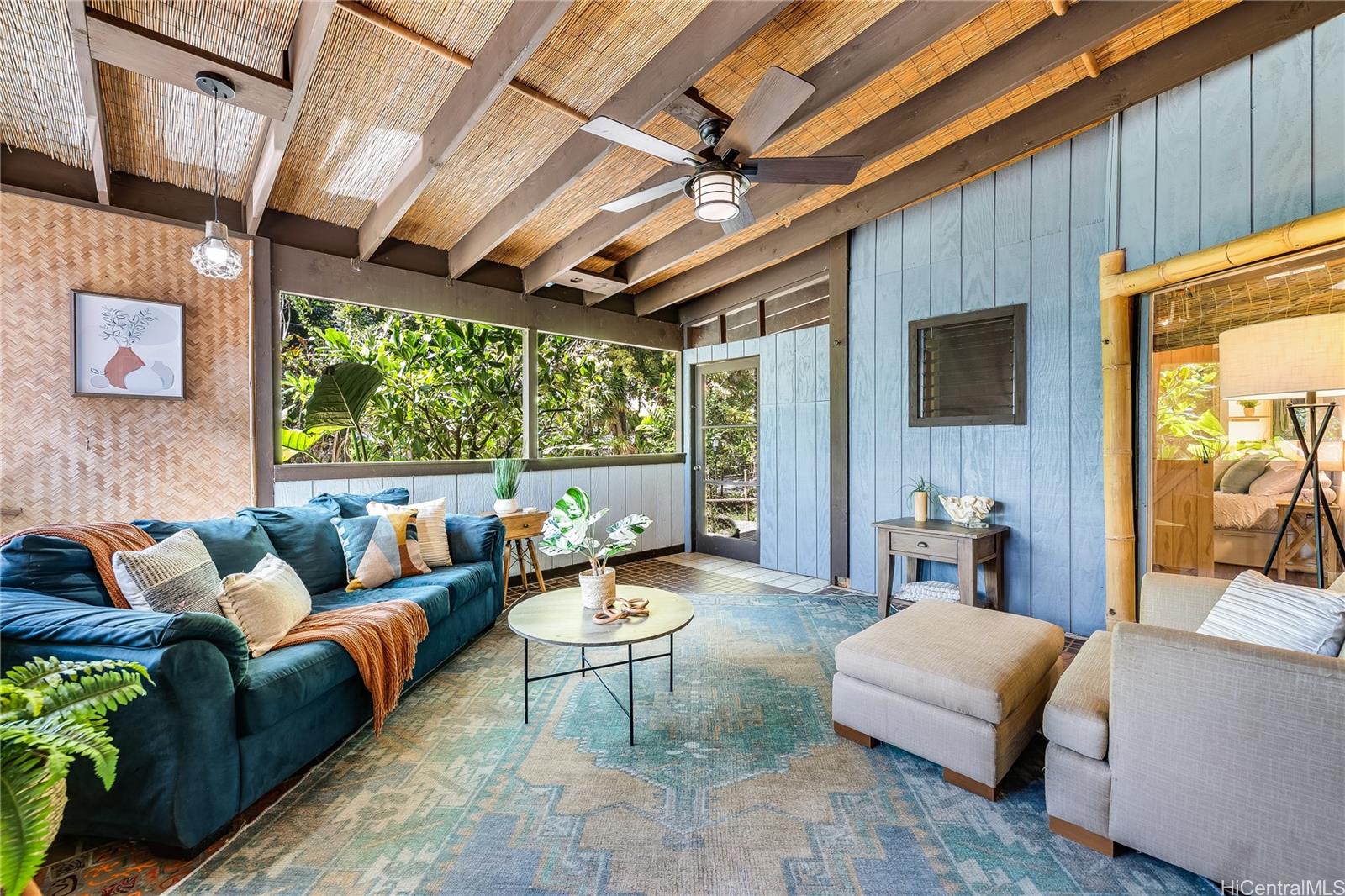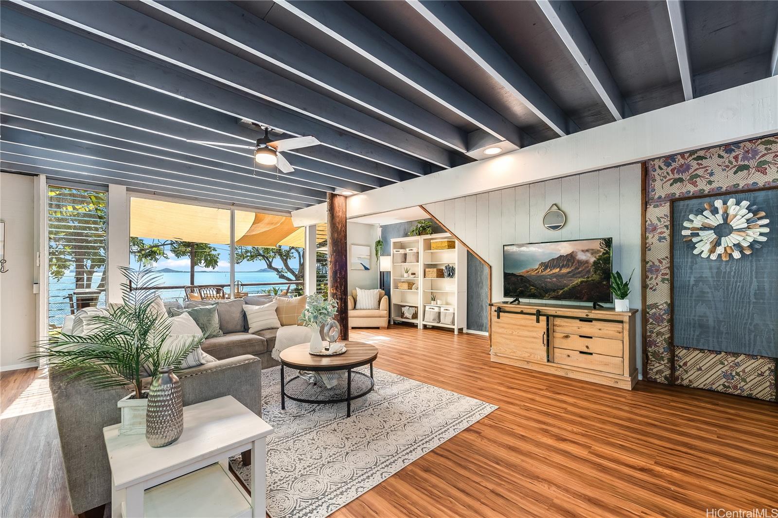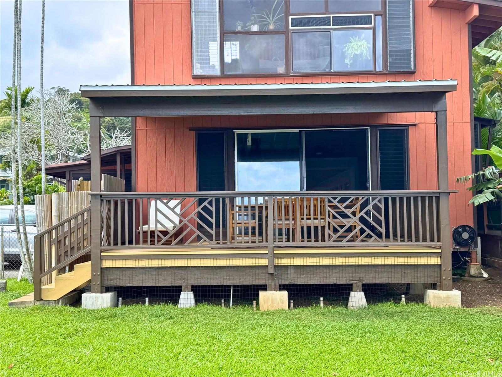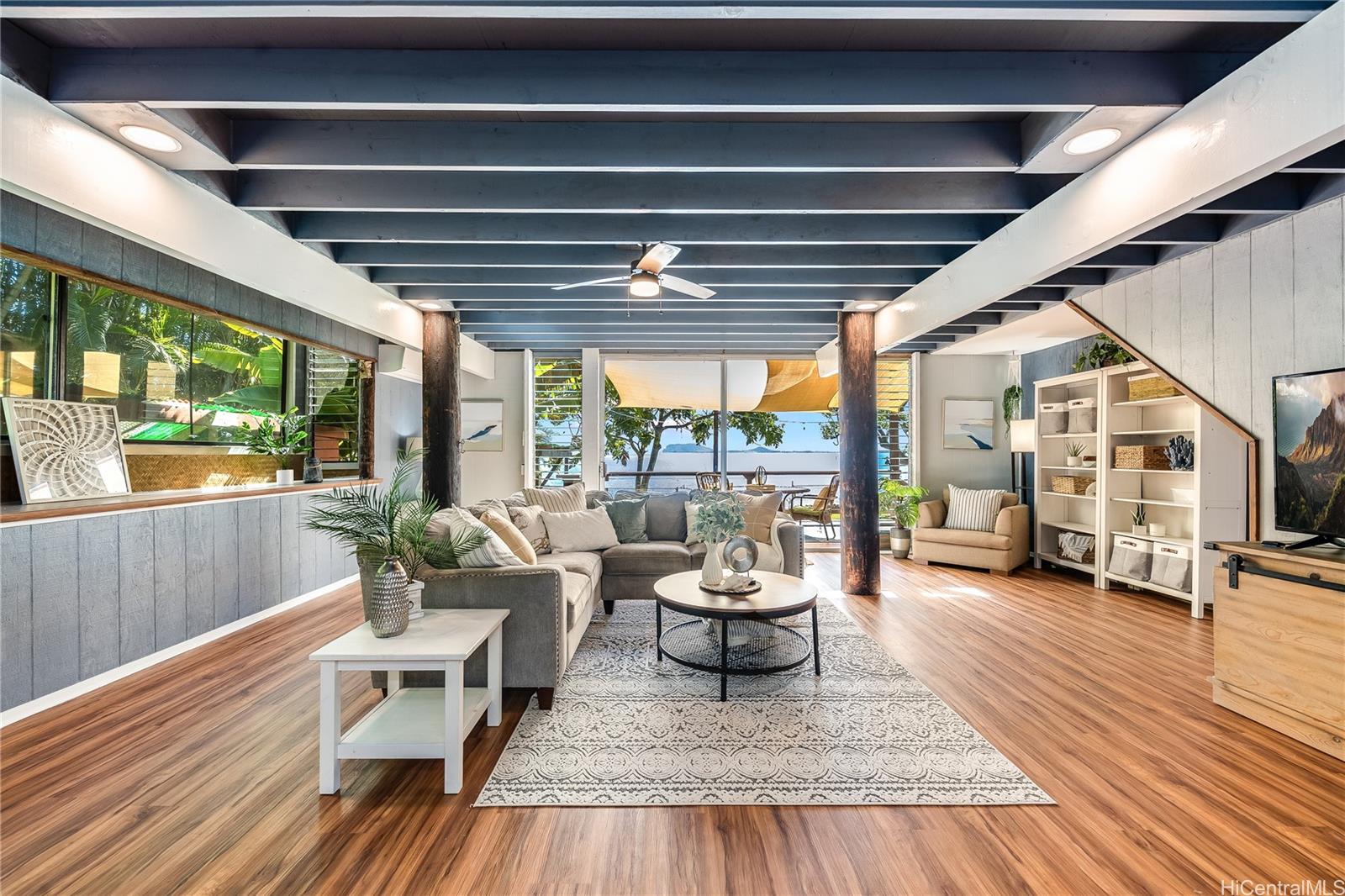 Experience serene waterfront living in Kahaluu! This spacious 3,088 sq. ft. property offers 3 bedrooms and 3 bathrooms, blending peaceful country charm with the convenience of Kaneohe just minutes away. The main living area features 3 bedrooms, 2 bathrooms, vaulted ceilings, and an open layout showcasing stunning views of Kaneohe Bay. Set on a lush 1/3-acre lot, you’ll find banana, and lime trees, garden spaces, beds of manicured tropical plants, and a covered cooking area with two gas grills. Enjoy breathtaking sunrises from the covered deck overlooking the bay, then fish, kayak (3 included), or boat straight from your backyard. Designed for comfort and sustainability, the home includes 46 Tesla solar panels, 3 Powerwall batteries, split A/C and window units throughout, a carport, and a massive garage/workshop fully equipped with tools and maintenance materials. The home is being sold furnished, and the seller is open to including his 20’ bay boat with the sale! Three attached studio spaces, each with a private entrance and wet bar, offer flexibility for guests, extended family, or creative use.