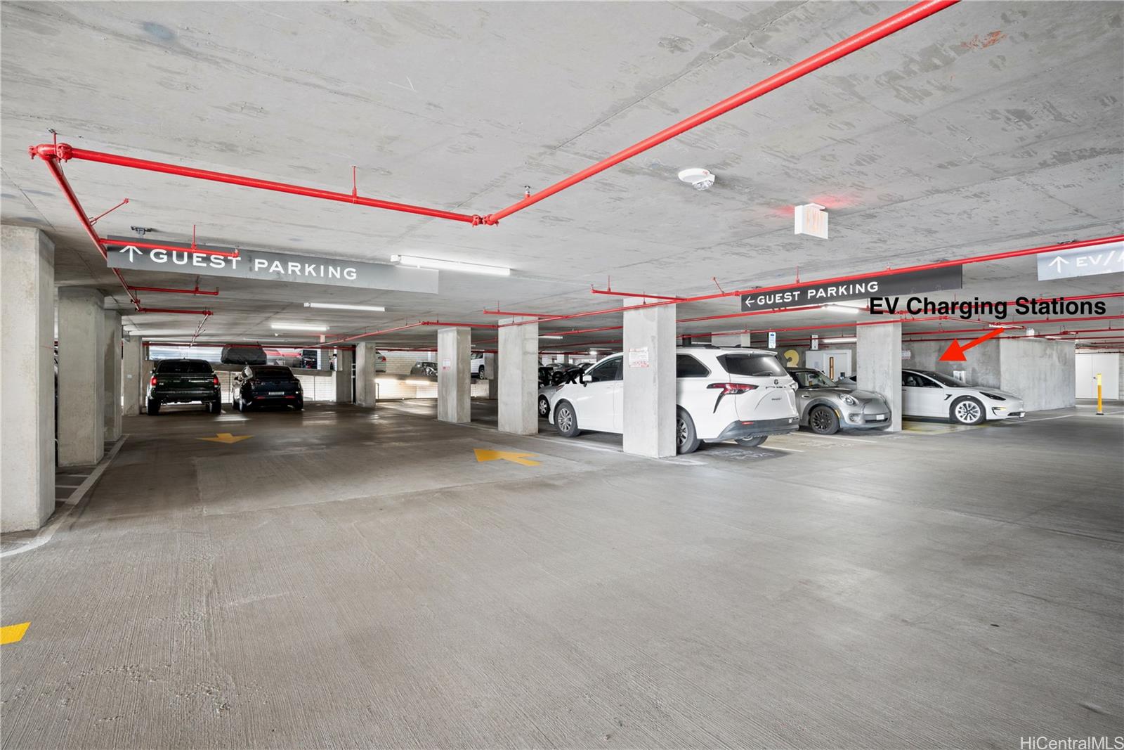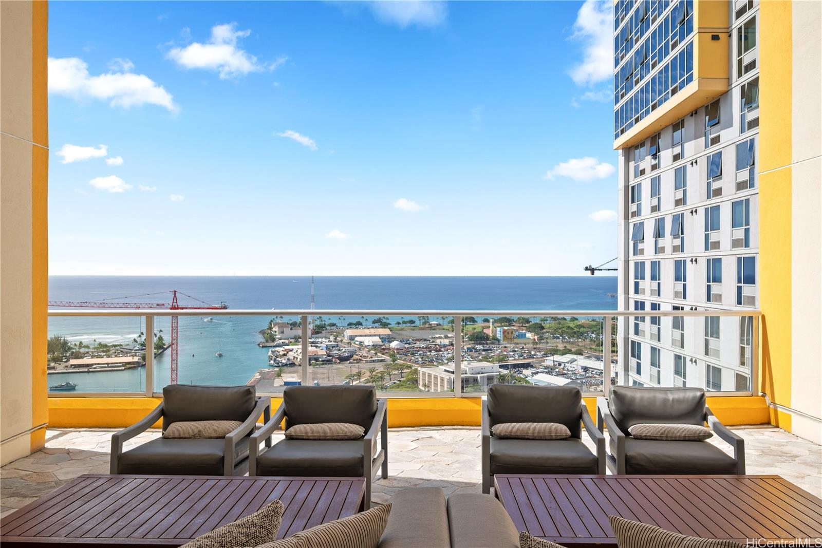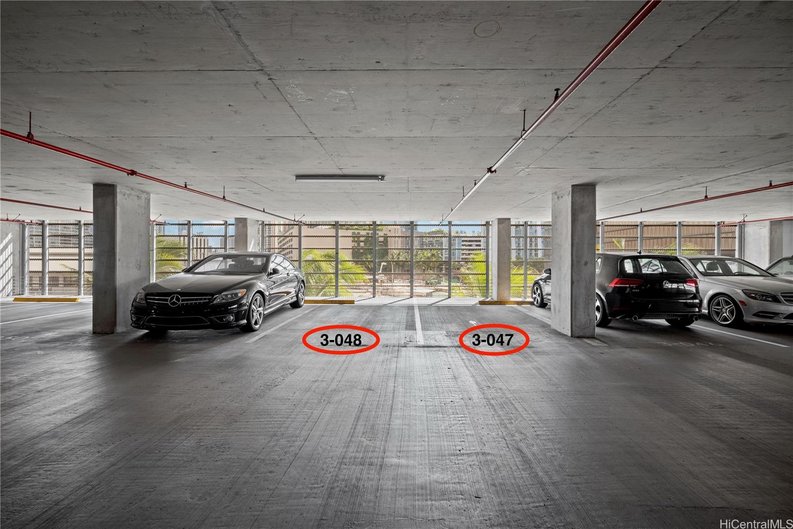 Enjoy Life on the Top Floor! Experience modern urban living in this beautifully upgraded penthouse residence, featuring 9-foot ceilings, luxury vinyl flooring throughout, motorized blinds and custom lighting. The open-concept layout includes a spacious living room, stylish kitchen island with upgraded kitchen backsplash, upgraded bathroom tile and cabinetry, smart toilets, and a custom-built desk and storage system in the primary bedroom. Stay comfortable year-round with split A/C units in every room. Located in the heart of Ward Village, you’re just minutes away from Whole Foods, movie theaters, popular restaurants, and Ala Moana Beach Park. Amenities galore, including a bbq area, recreation and karaoke rooms, conference and theater rooms, outdoor playground, children’s playroom, fitness center, yoga room, and more. Enjoy added convenience with a spacious storage room right down the hall, an additional storage locker on the 3rd floor (same level as your parking), and two full-size, side-by-side parking stalls. Move-in ready—your penthouse lifestyle awaits!