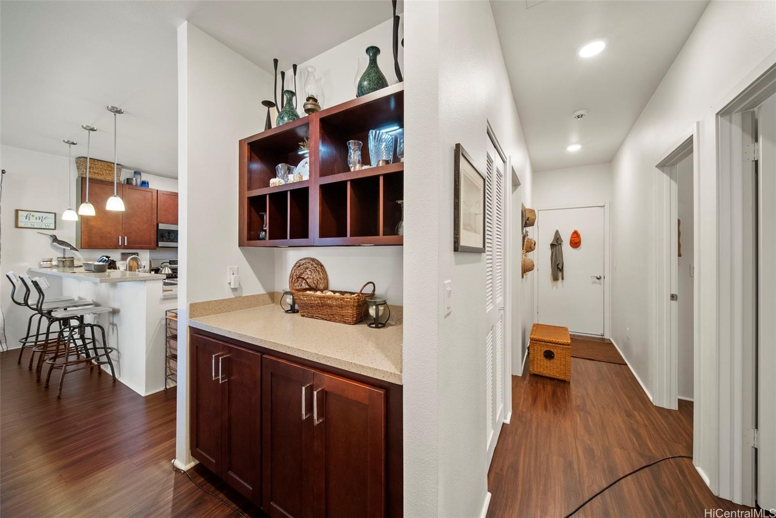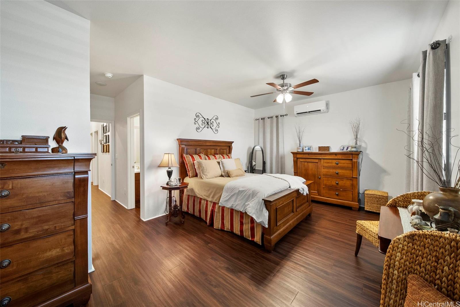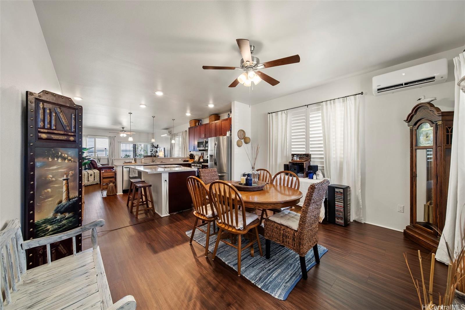 VA loan Assumable!!! This beautiful new home is located in the highly desired community of Hoopili. It offers easy access to shopping centers, the new rail system, and the highway.. This house is a well-maintained property with three bedrooms and two bathrooms. It is connected to natural gas, which provides several advantages. The gas range in the kitchen allows for efficient and precise cooking. Additionally, a tankless water heater ensures instant hot water while saving on energy consumption. There is also a gas BBQ stub, providing a convenient setup for outdoor grilling. While the current washer and dryer are electric, there is a gas hook-up available. Outside, the home features a spacious yard, perfect for entertaining, or enjoying outdoor activities. The property is equipped with 15 owned Solar (photovoltaic) panels and 2 Tesla Batteries, 5 ceiling fans, Plantation shutters throughout, and a dedicated 20 amp in lanai for the smoker. The large covered lanai provides a comfortable space to relax and appreciate the beautiful surroundings. This community also offers a range of other amenities, including playgrounds, a pool, a rec center, and a pickleball court.