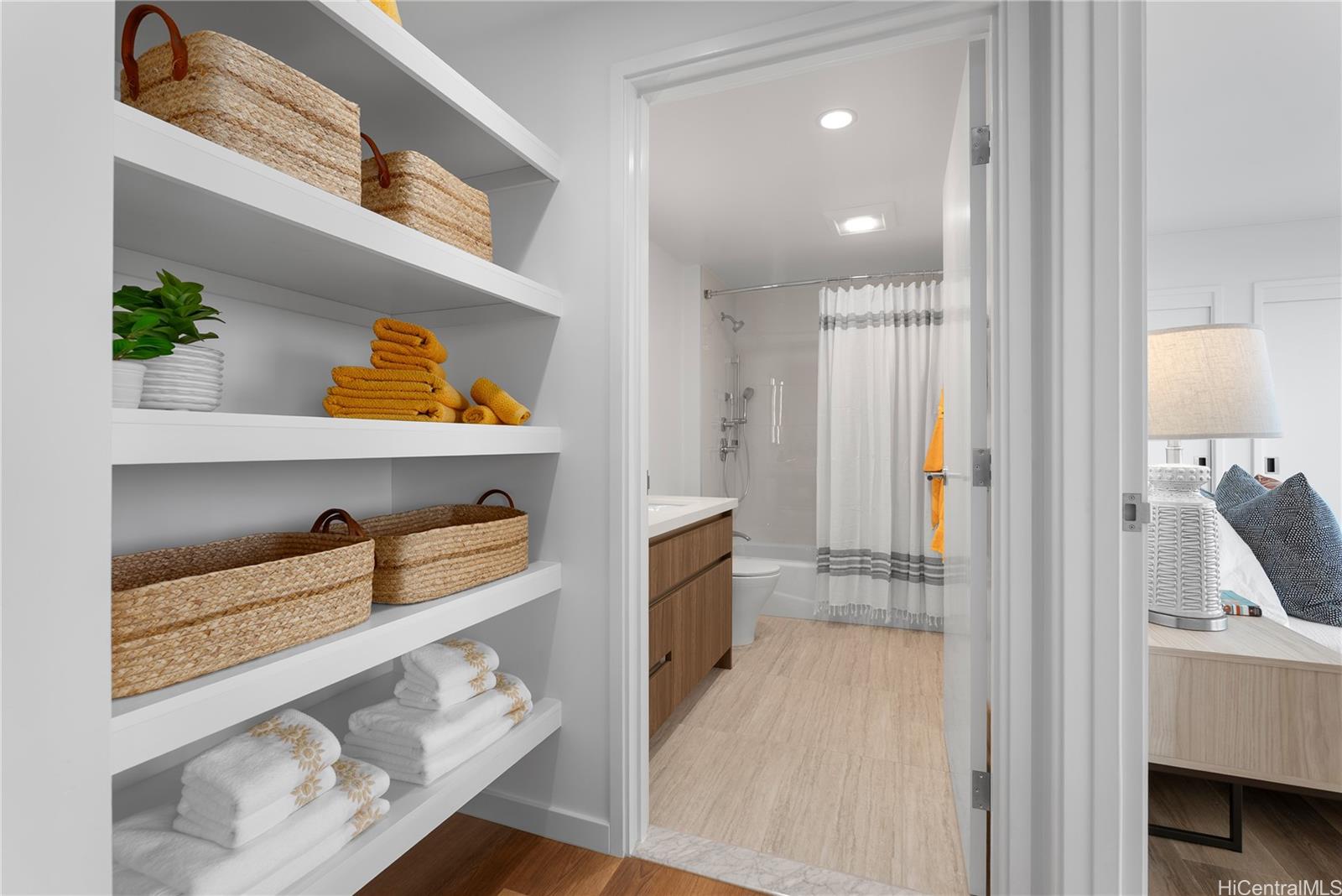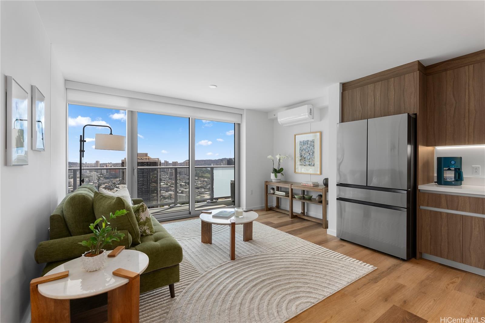 The Park on Ke'eaumoku is completed & resales present an EXCELLENT opportunity to buy NEW without the wait! Located in the Liona Tower, this preferred larger 1-bedroom, "07"unit is move-in ready, INCLUDING FURNITURE, AUTO WINDOW SHADES, HARDWOOD FLOORS! Ideal high-floor unit on the cooler east facing side, with unobstructed, sweeping mountain, Diamond Head, & Waikiki views. Enjoy colorful rainbows on misty mornings as the sun rises, & expansive city lights in the evenings. Wonderful, East facing breezes filter through the unit for those who prefer a fresh atmosphere of Hawaii's clean air! The Park On Ke'aumoku is centrally located in urban Honolulu, within minutes to a wide variety of restaurants, Ala Moana Shopping Center, Ala Moana Beach park, nightlife & Honolulu's lively urban scene. These resort style amenities make this price a bargain: INFINITY POOL, CABANAS, WHIRLPOOL SPA, BBQ PAVILIONS, CLUB ROOM, FITNESS, YOGA STUDIO, SAUNA, CO-WORK SPACES, MEDIA LOUNGE & PRIVATE MOVIE THEATER. As building costs continues to rise, Honolulu's newest residential landmark condominium, offers the perfect first time home, investment or vacation retreat!