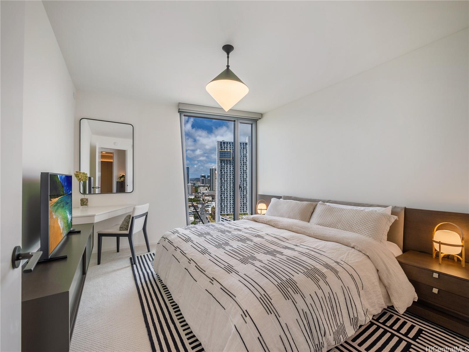 This attractive, upgraded, fully furnished Koula condo offers one bedroom, one bath, and one assigned parking space with an EV charger. Features include motorized drapes, designer wallpaper, and custom built-ins. Enjoy high-end Miele appliances, a modern aesthetic, and access to resort-style amenities. Located in the award-winning Ward Village development, this condo offers convenient access to beach parks, theaters, restaurants, and Ala Moana Center. The building features an open-air lobby, a park-like setting, and over an acre of outdoor amenities, including barbecue areas, a fitness center, and spa pools.