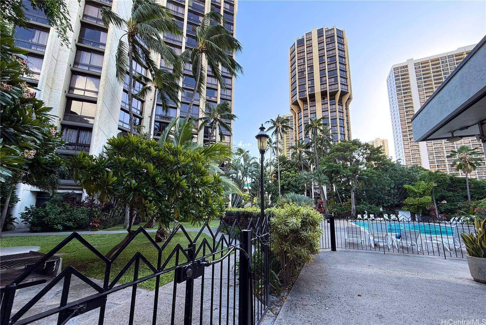 Welcome to island living in the heart of Waikiki! This well-maintained studio in the desirable Queen Tower of Liliuokalani Gardens offers a peaceful retreat with stunning views of Diamond Head. Enjoy natural light, cool breezes, and a functional layout. This secure, resort-style community is rich with amenities including lighted tennis courts, a large swimming pool, relaxing spa/whirlpool, BBQ and picnic areas surrounded by beautiful tropical landscaping, bicycle and surfboard storage, community laundry, and ample guest parking. Moped parking is also available, and residents have the option to rent a parking stall onsite for just $300 annually (subject to availability). Conveniently located at the quiet end of Waikiki, just minutes from world-famous beaches, Kapiolani Park, Honolulu Zoo, shopping, dining, and entertainment. Experience the best of urban living with a relaxed island feel!