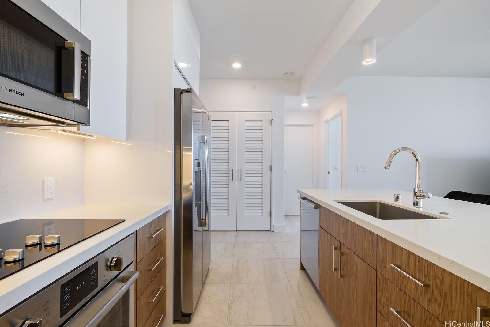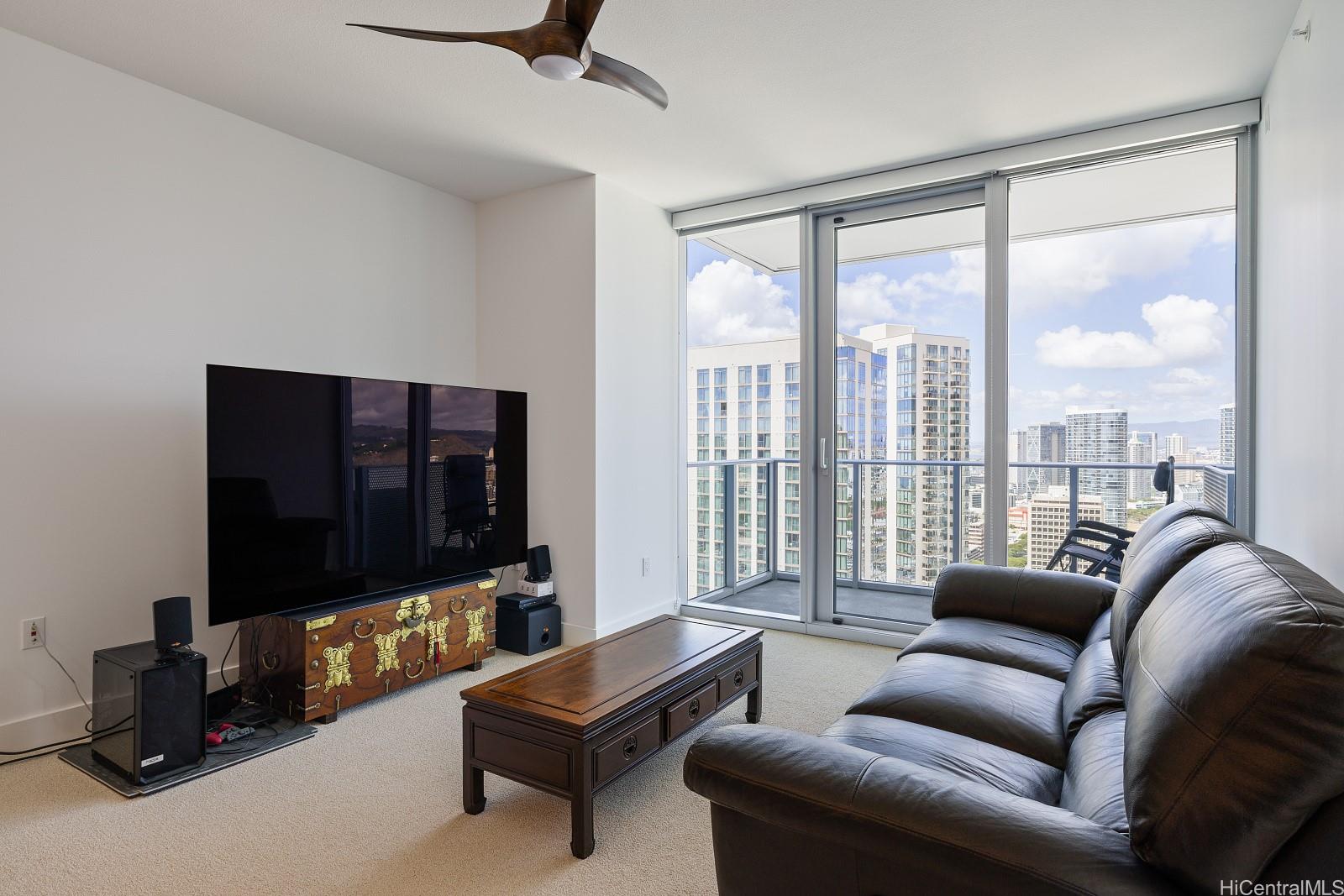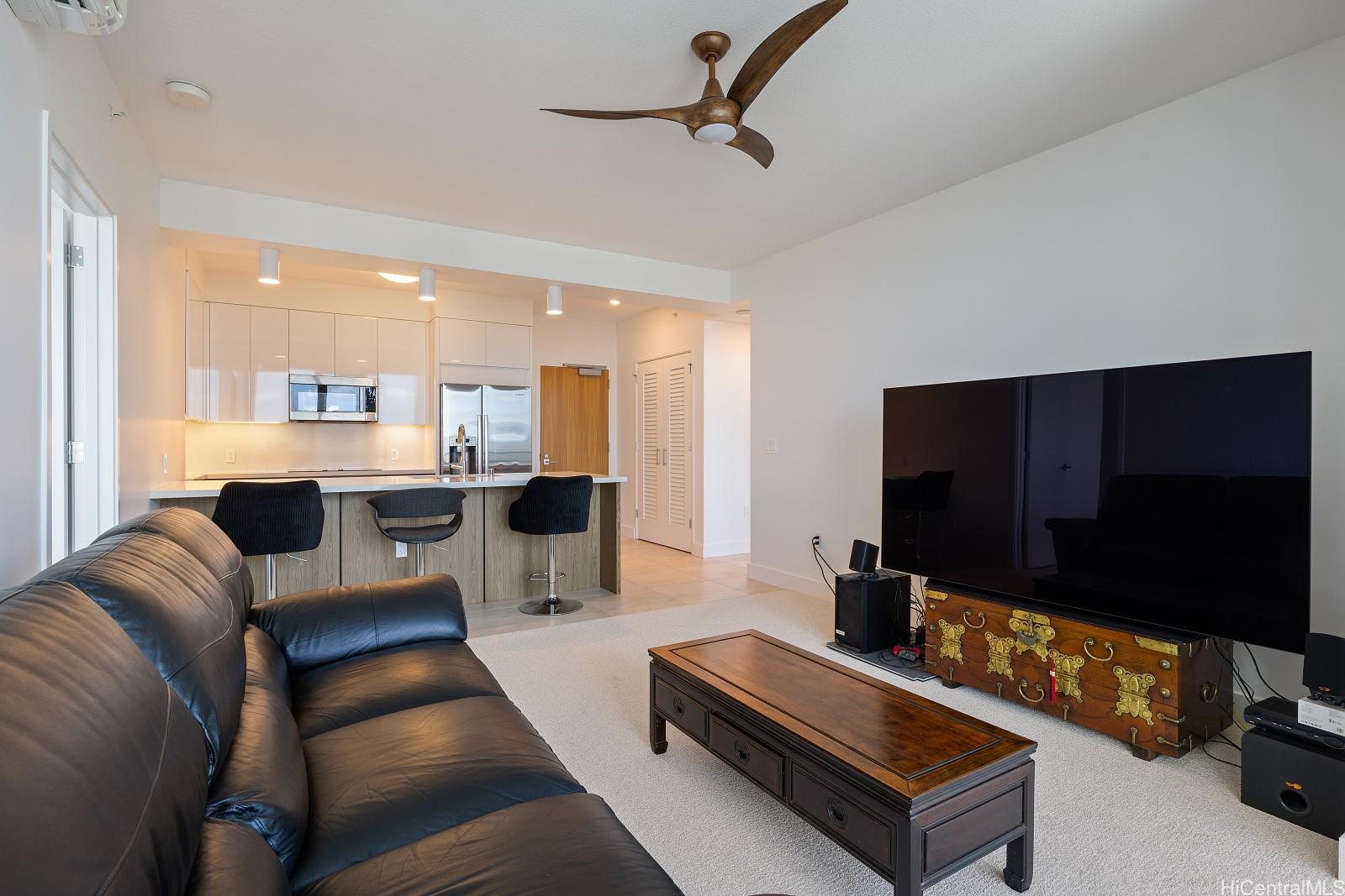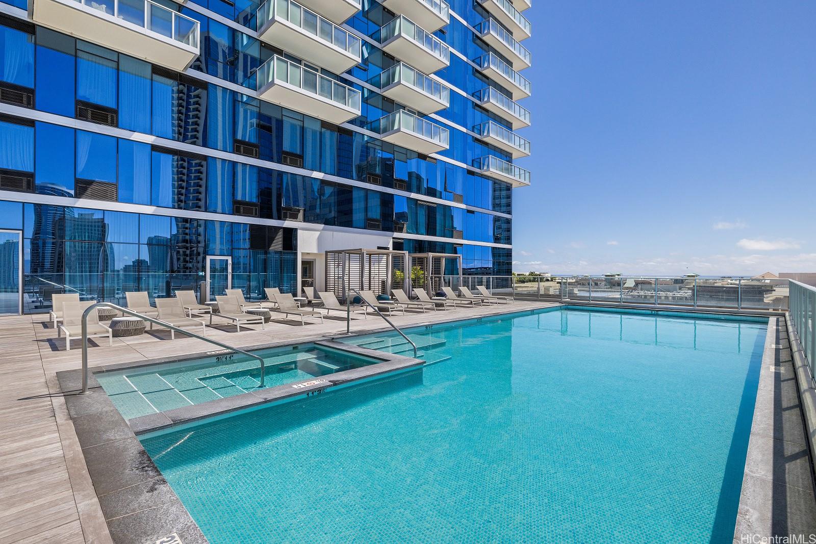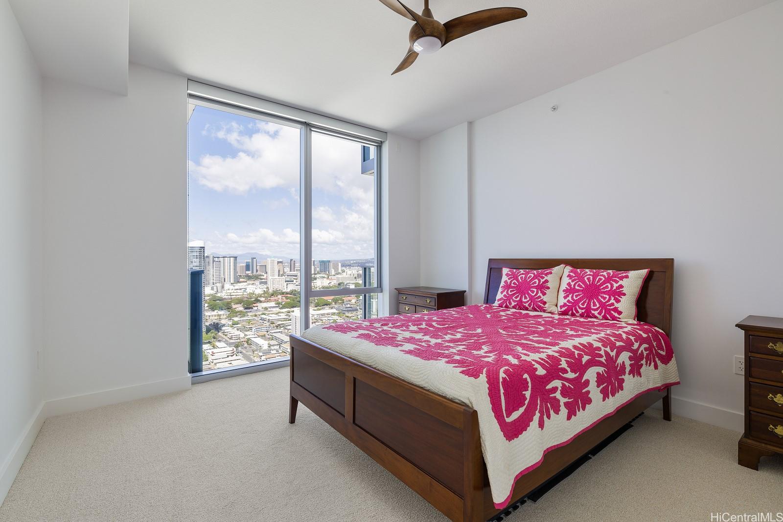 Enjoy luxury convenient living on the 35th floor in Mid town Honolulu.  Built in 2021,the unit is in Excellent Condition with 9 foot high ceilings with ceiling fans in the bedrooms and living room.  Enjoy the ocean and mountain views from the living room, lanai and both bedrooms.   Azure offers an exercise room, recreation room,  movie theater, 4 grills and 2 cabanas, puppy park, 4 guest rooms for out of town visitors, and concierge services. The unit has two parking stalls and storage.  Across the street from Ala Moana Center, Walmart, Sam's Club, great restaurants and much more.  Very close to Magic Island and Ala Moana beach. Azure is fully covered with 100% hurricane nsurance.