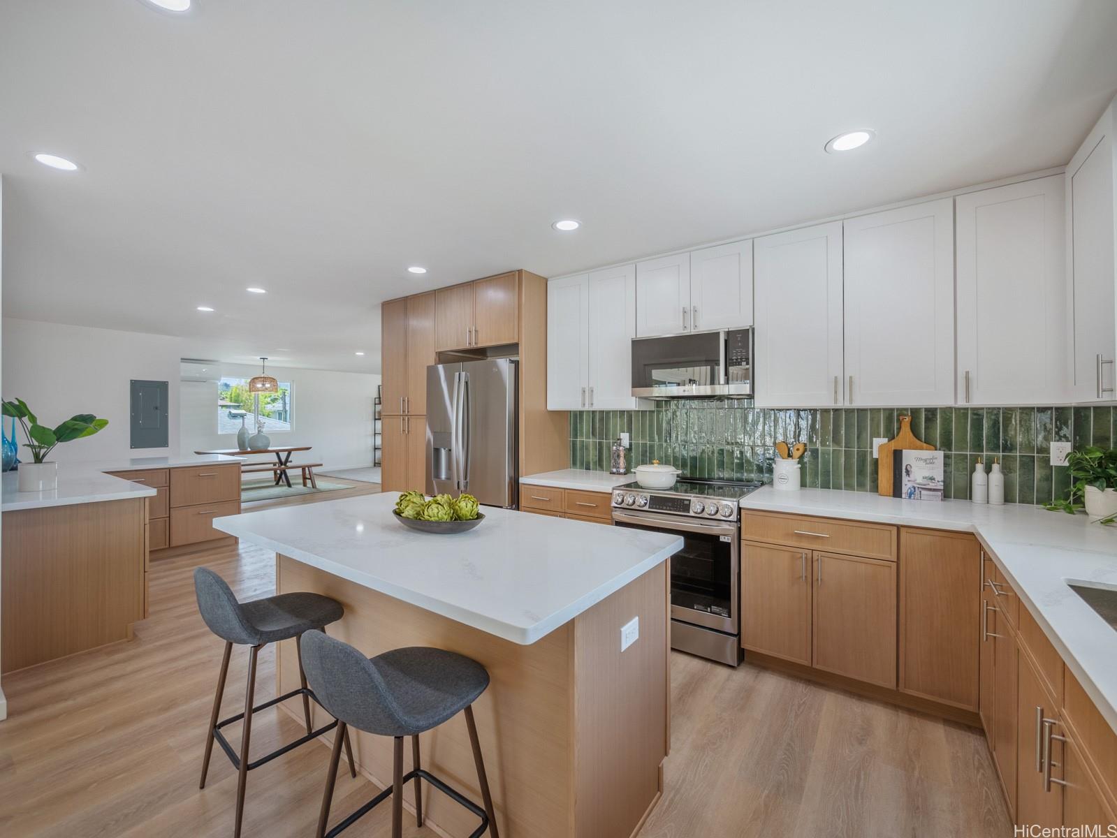 Brand new construction in Kailua's Coconut Grove neighborhood! This 2-story, 5-bedroom, 3-bath single-family home is thoughtfully designed for multi-generational living. The lower level offers 2 bedrooms, 1 bath, and a wet-bar-- ideal for extended family or guests-- while the upper level includes 3 bedrooms, 2 baths, and a bright living room filled with natural light and mountain views through large windows. Enjoy two expansive covered lanais, including an upstairs lanai perfect for relaxing or entertaining with scenic views. Modern finishes and stainless steel appliances complement this fresh, functional layout. A 2-car garage plus driveway parking provides ample space for vehicles and storage. Conveniently located near Kailua Beach, schools, shopping, and dining. For estimated property taxes, assessed value is only land value as the county has yet to assess the improvement value of the subject property. Next Open House Sunday, December 21st, 2pm-4pm.