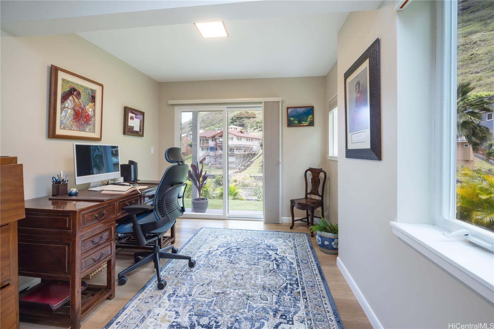 Nestled at the back of Niu Valley, this elegant home offers a perfect blend of privacy, style, and sophisticated living. Enjoy beautiful mountain and distant ocean views from multiple vantage points. The generous yard provides a haven for gardeners or a perfect space for outdoor entertaining and play. The home exudes style, featuring vaulted ceilings, abundant natural light, and a thoughtful layout and curated remodel inside and out. The primary suite is separate, well-appointed, offering comfort and privacy for family or guests and a spacious 2-car garage includes extra storage. This lovely home is move-in ready, an excellent value in the current market! Conveniently situated near beaches, parks, restaurants, shopping, schools, and hiking trails, this sought-after Niu Valley location in East Honolulu offers easy access to everything you need. Enjoy the comfort and peaceful setting of this desirable neighborhood and the refined island living this home presents.