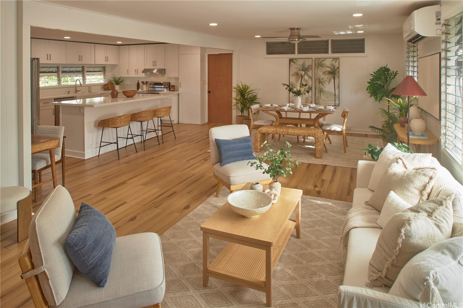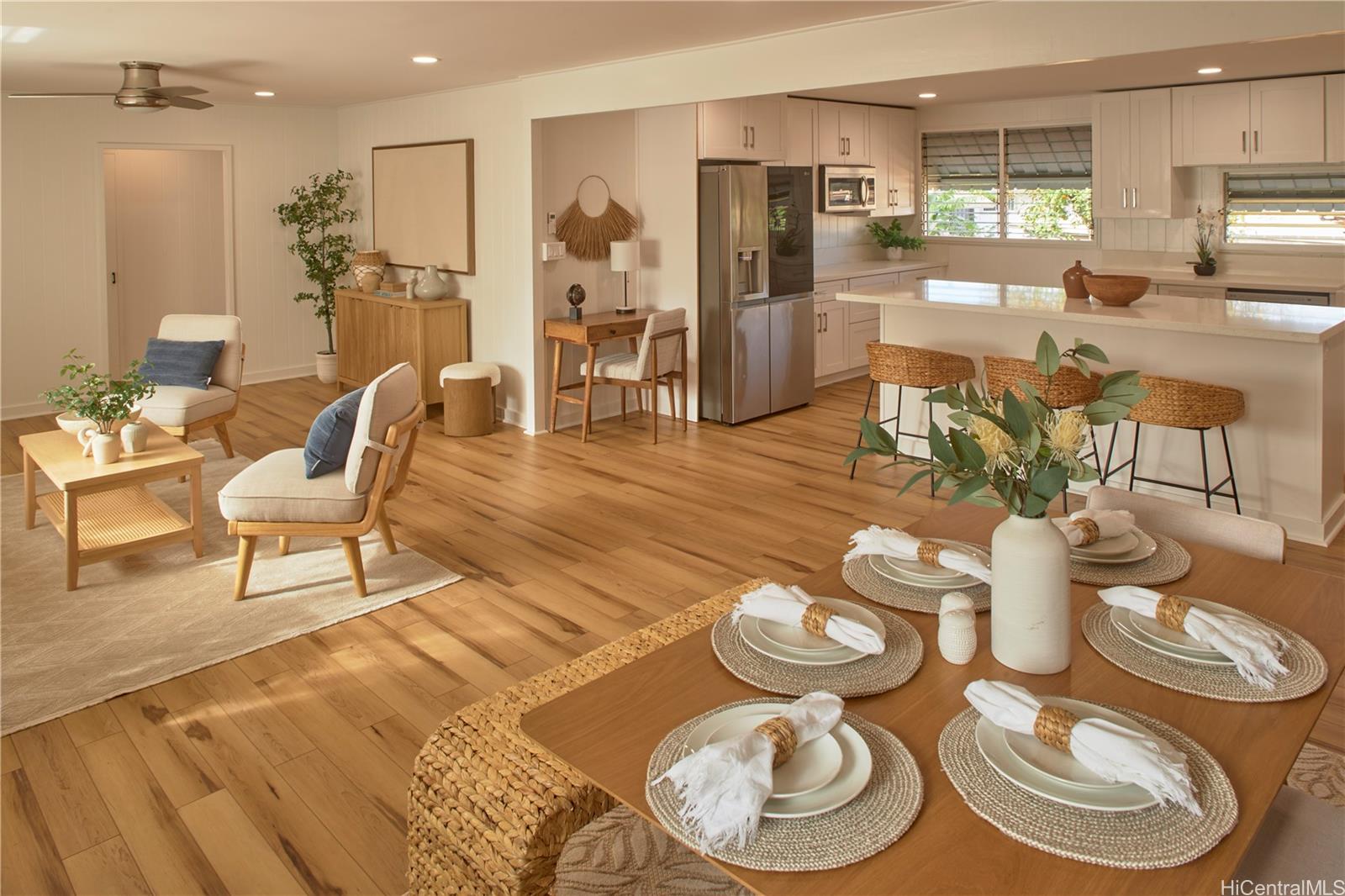 Located in this quiet, established neighborhood is this wonderful, upgraded single-level home. Beautiful and bright, the large kitchen has stainless appliances including beverage fridge, generous counter space and kitchen island, and soft close cabinetry. Ceilings are smooth drywall and there's recessed lighting in kitchen, dining and living areas. The floorplan flows beautifully, making the home feel spacious, and the split a/c and ceiling fans make for comfortable living. The many windows bring natural light and breezes. Vinyl flooring in kitchen/living area and the nicely sized bedrooms are carpeted. Roof is less than 10 years old; there's fresh paint inside and out and a renovated bathroom. Updated electrical and all copper plumbing including new drain lines. These many updates make this home move-in ready! The large, level corner lot feels private, is fully fenced and has mature mango, lychee, avocado, papaya and tangerine trees, and banana plants. The carport is extra-large for multiple cars and has storage. Stellar location, just minutes to freeway access and close to Don Quixote, Walmart, Home Depot, and restaurants. Home was just tented and has a warranty. A must-see home!