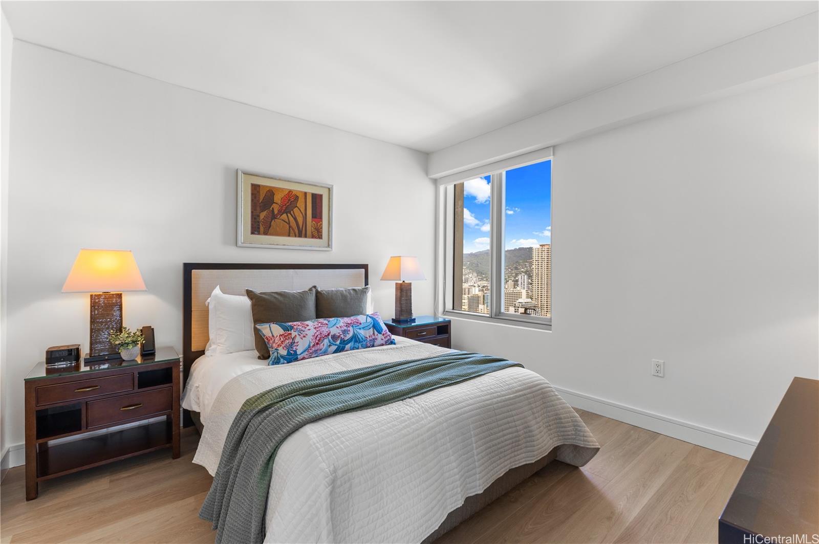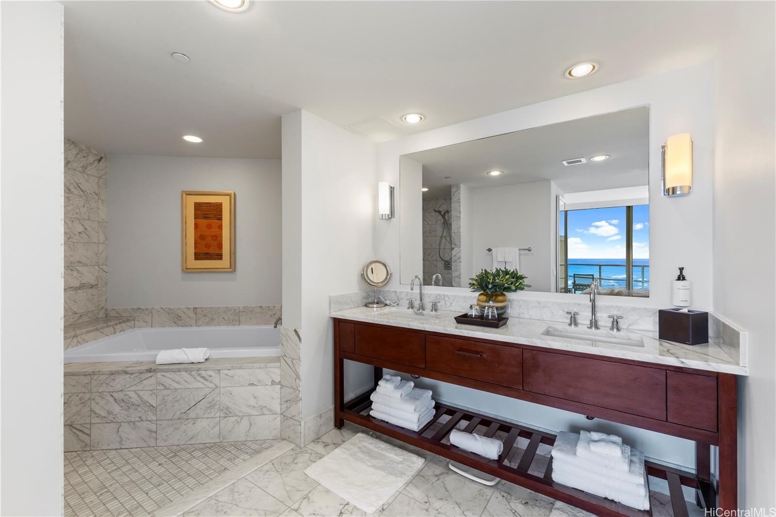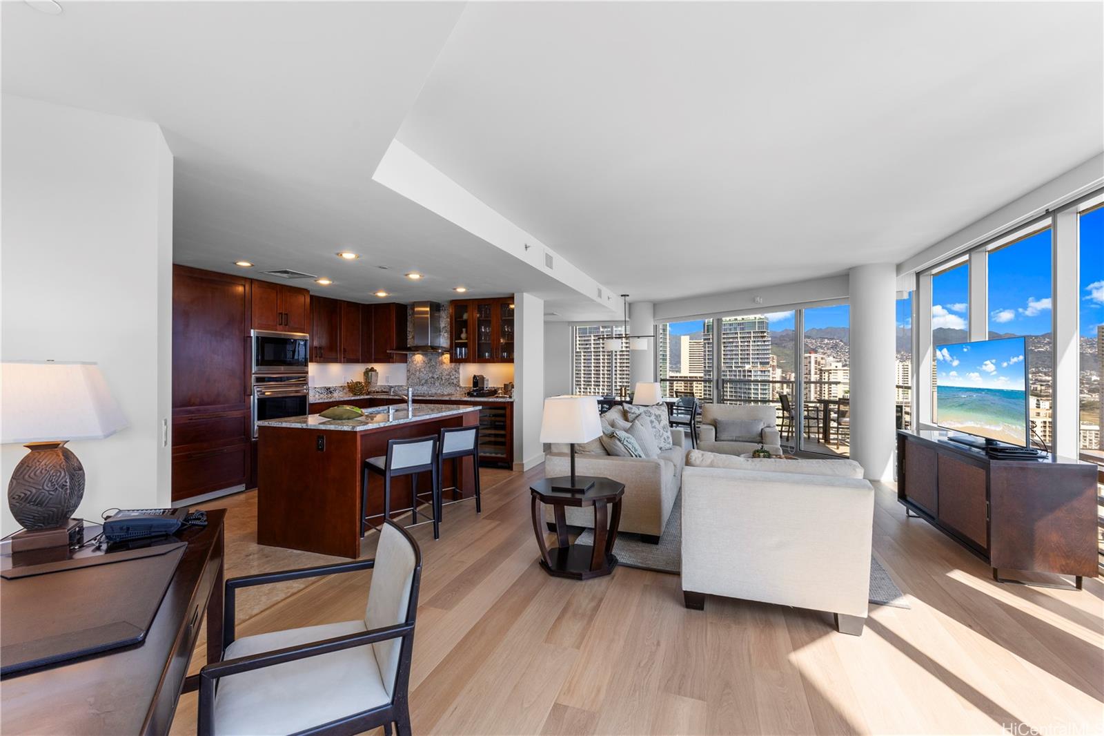 ワイキキビーチからわずか数分の距離にある、エレガントにアップグレードされたこの角部屋ユニットは、真のリゾートスタイルの生活を提供します。近隣には様々なレストランがあり、ホテル内でのお食事やルームサービスもご利用いただけます。山々に囲まれた街のスカイライン、ハワイカイのココクレーターとココヘッド、ダイヤモンドヘッド、そしてワイキキビーチを背景にした象徴的なピンクパレスなど、雄大なパノラマビューをご堪能ください。2つの独立したラナイでゆったりとおくつろぎください。1つは主寝室に面した海側、もう1つはリビング・ダイニングエリアに面しており、美しい山々の景色を望めます。設備の整ったキッチン、広々としたバスルーム、主寝室のウォークインクローゼットを含む十分な収納スペース、そして細部まで行き届いた配慮が随所に施されています。最近改装された真新しいエンジニアードハードウッドフロアは、家全体に優しい温かさと快適さをもたらします。ここは心身ともに癒される空間であり、床の大切さを改めて実感させてくれます。新しくモダンなローラーシェードは、このコーナーユニットならではの180度の素晴らしい眺望を最大限に引き出すよう設計されています。最高級のラグジュアリーなアイランドライフをご体験ください。