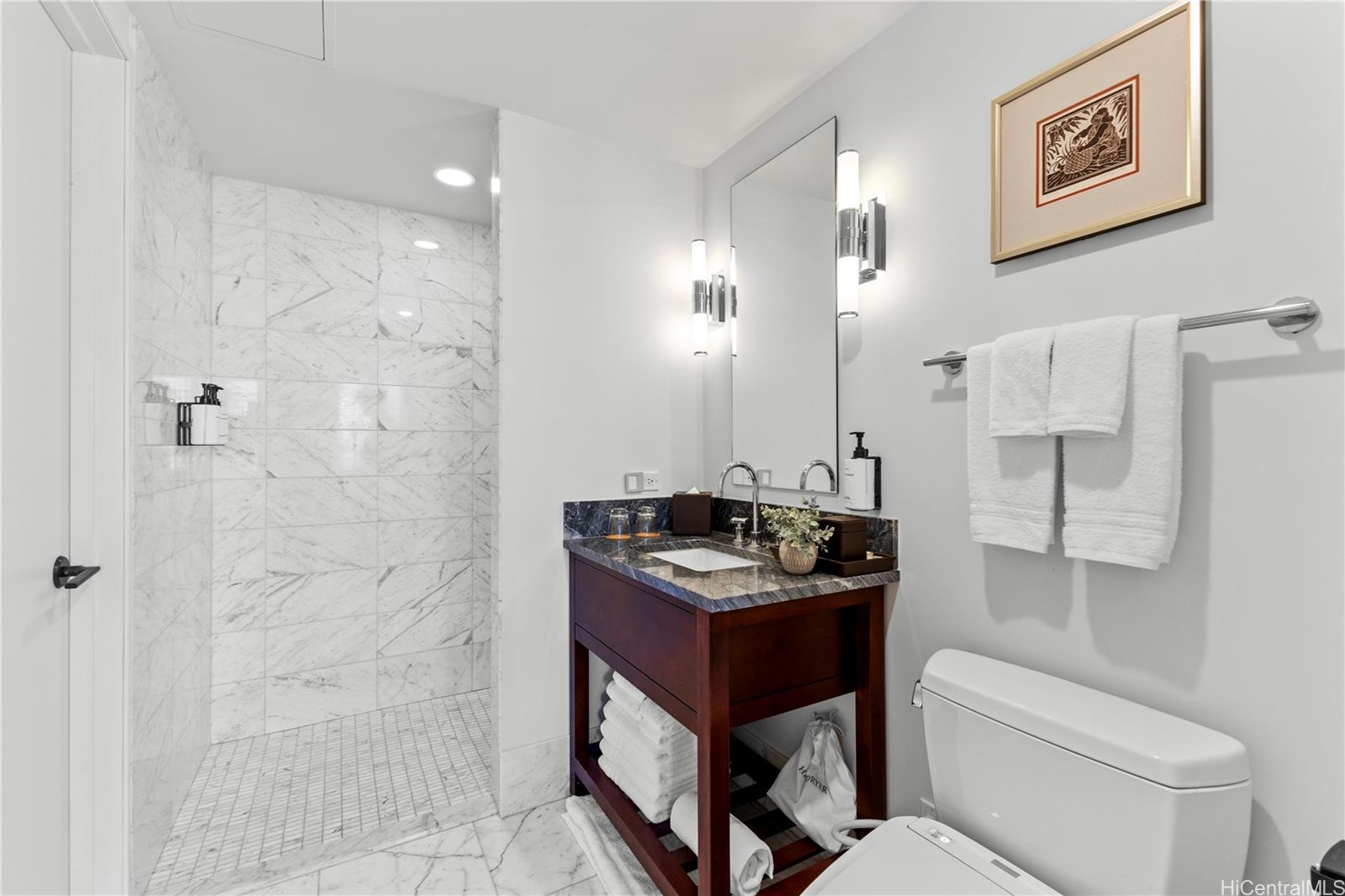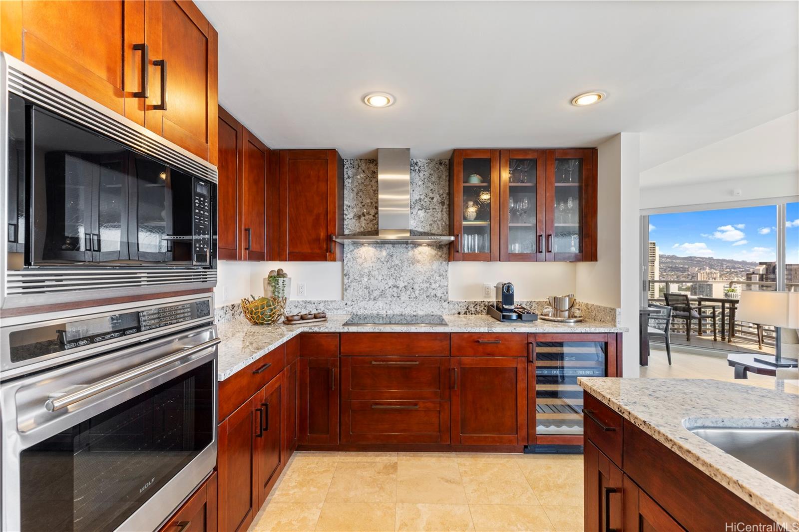 Take in sweeping panoramic views of the city skyline framed by the mountains, Koko Crater and Koko Head in Hawaii Kai, Diamond Head, and the iconic Pink Palace with Waikiki Beach as its backdrop. Relax on two separate lanais: one off the primary bedroom facing the ocean and the other off the living-dining area with beautiful mountain views.