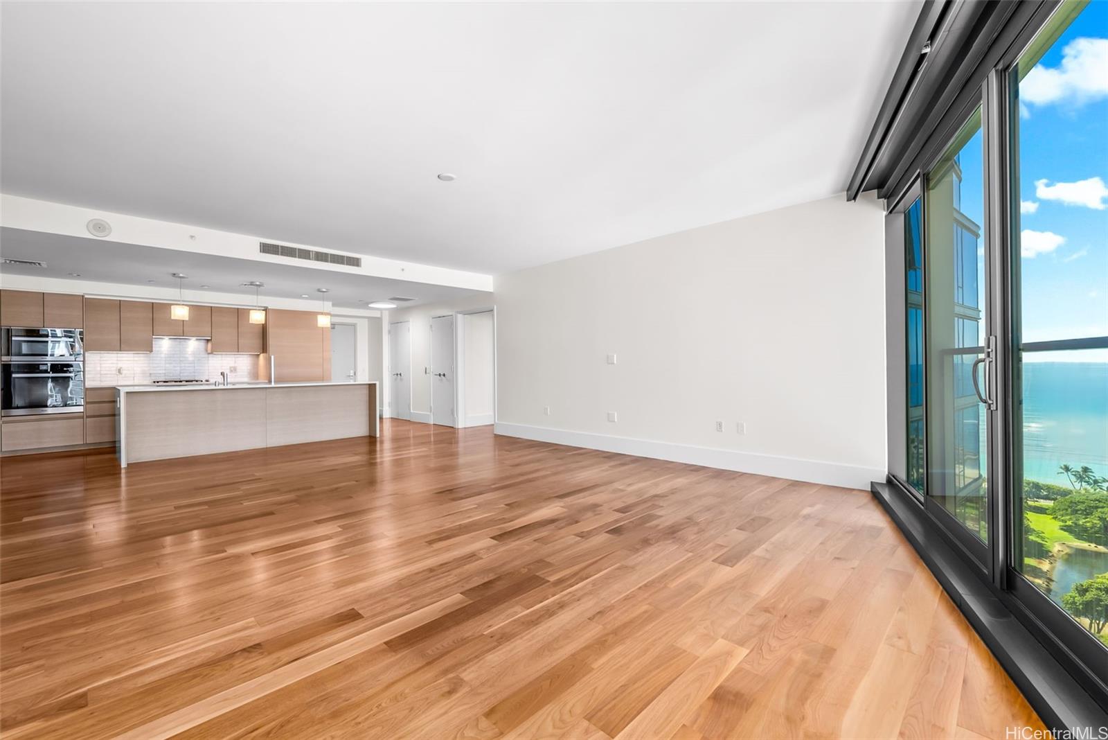 Exceptional 2-bedroom, 2-bath residence in Ward Village, a master-planned community attracting both local and global residents with its blend of urban convenience and modern refinement. This larger 2 bedroom condo offers an open-concept floor plan, ideal for entertaining, and features high ceilings throughout. The chef’s kitchen is equipped with Miele appliances, including a gas range and wine refrigerator, and a breakfast bar with upgraded pendant lighting. Additional features include a separate laundry room with built-in shelves, upgraded wood floors in the bedrooms, motorized shades throughout and an air-conditioned storage room (on the 5th floor). Enjoy stunning views of the ocean by day and twinkling city lights by night from almost every room. Residents have access to world-class amenities, including a glass-bottom pool, whirlpool, tennis court, golf simulator, BBQ cabanas, a chef's kitchen and dining room, gym, theatre, guest suites and other amenities that rival white-glove condos in other global luxury markets. Conveniently located within minutes to Whole Foods, beaches, the marina, Urgent Care and hospitals, shopping and dining.