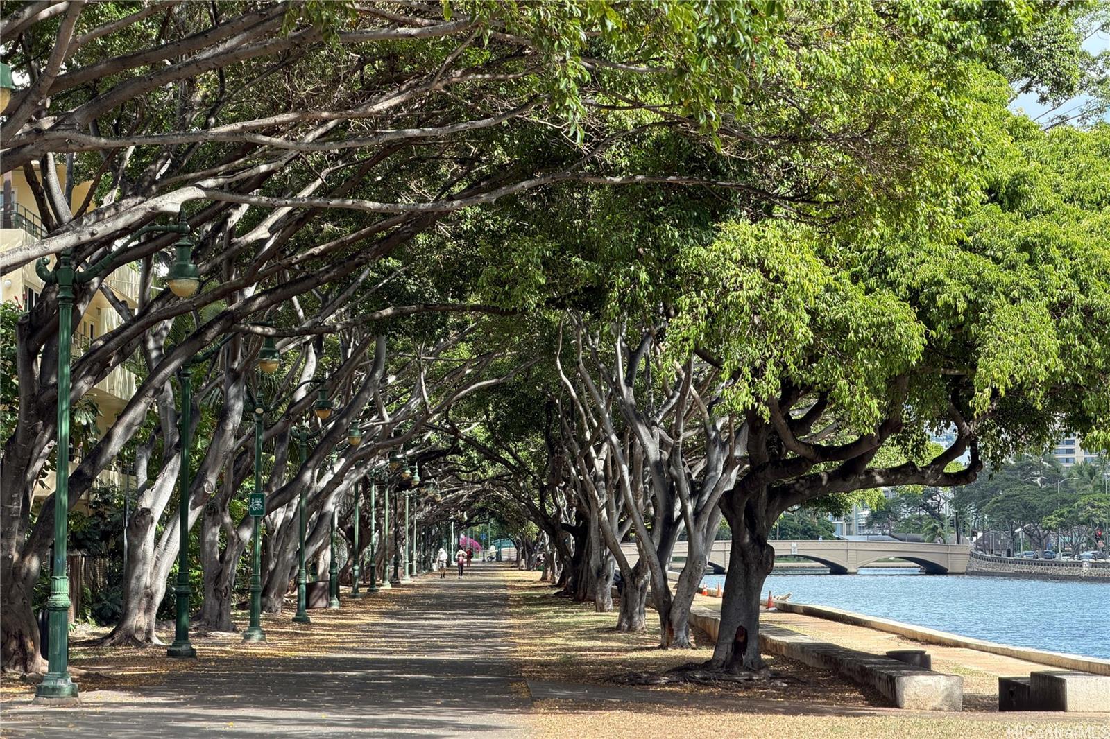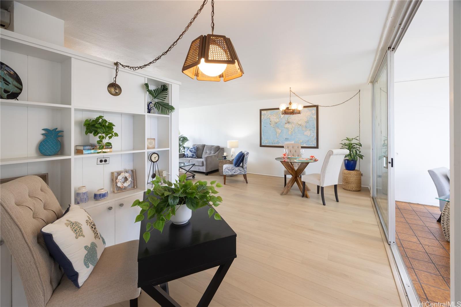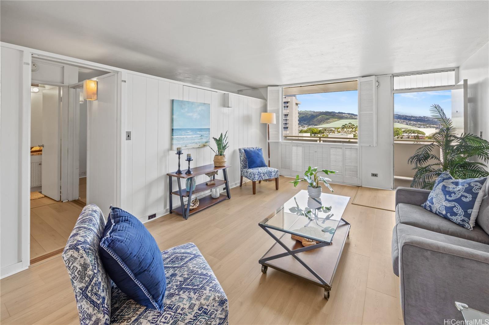 Welcome to Atkinson Towers! This high rise condo is just steps from Ala Moana Beach, the beauty of Magic Island, and Ala Moana Shopping Center. With direct access to the Ala Wai Promenade and the fun energy of Waikiki, you're perfectly positioned for ocean adventures, dining & entertainment. Step into this inviting 792-square-foot, 1-bed/1-bath gem where nostalgia meets modern elegance. Discover charming original features like built-in bookshelves, a dresser, and vanity drawers, complemented by a unique stainless steel integrated countertop. Newly installed luxury vinyl plank flooring and smooth ceilings (no popcorn!) add a touch of modern style and easy maintenance. Imagine unwinding on your enclosed lanai, soaking in the peaceful ocean views and breathtaking sunsets—what a delightful way to end the day! Inside, you'll find a full-size washer and dryer, along with extra storage closets. Plus, there's an additional storage locker on the same floor, making it easy to keep your space tidy and organized.