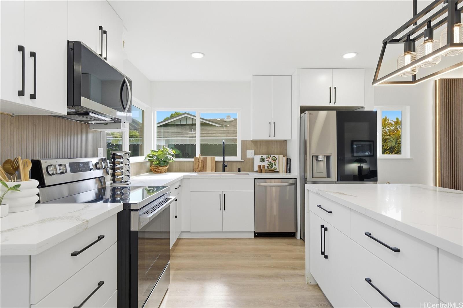 一目見ただけで心を奪われる、美しく改装された角地の住宅。まさに現代的なアイランドラグジュアリーを体現しています。リゾート風の仕上げとエレガントな特注のアップグレードが施され、細部までこだわったデザインは、温かさと洗練さを兼ね備えています。光があふれるリビングスペースはシームレスに繋がり、エンターテイメントに最適なキッチン、スパのようなバスルーム、そして作り付けの棚とデザイナーによるアクセントウォールがプライベートサンクチュアリのような主寝室を備えています。3ベッドルーム、2バスルームのこの住宅は、広々としたフェンスで囲まれた庭と果樹が植えられた5,700平方フィートの広々とした角地に建っています。マリナーズバレーの息を呑むような景色、電気代を抑える自社所有の18枚の太陽光発電パネル、そして公園、ビーチ、レストラン、ショッピング街に近いハワイカイの最高のロケーションをお楽しみください。まさにアイランドライフの真髄と言えるでしょう。