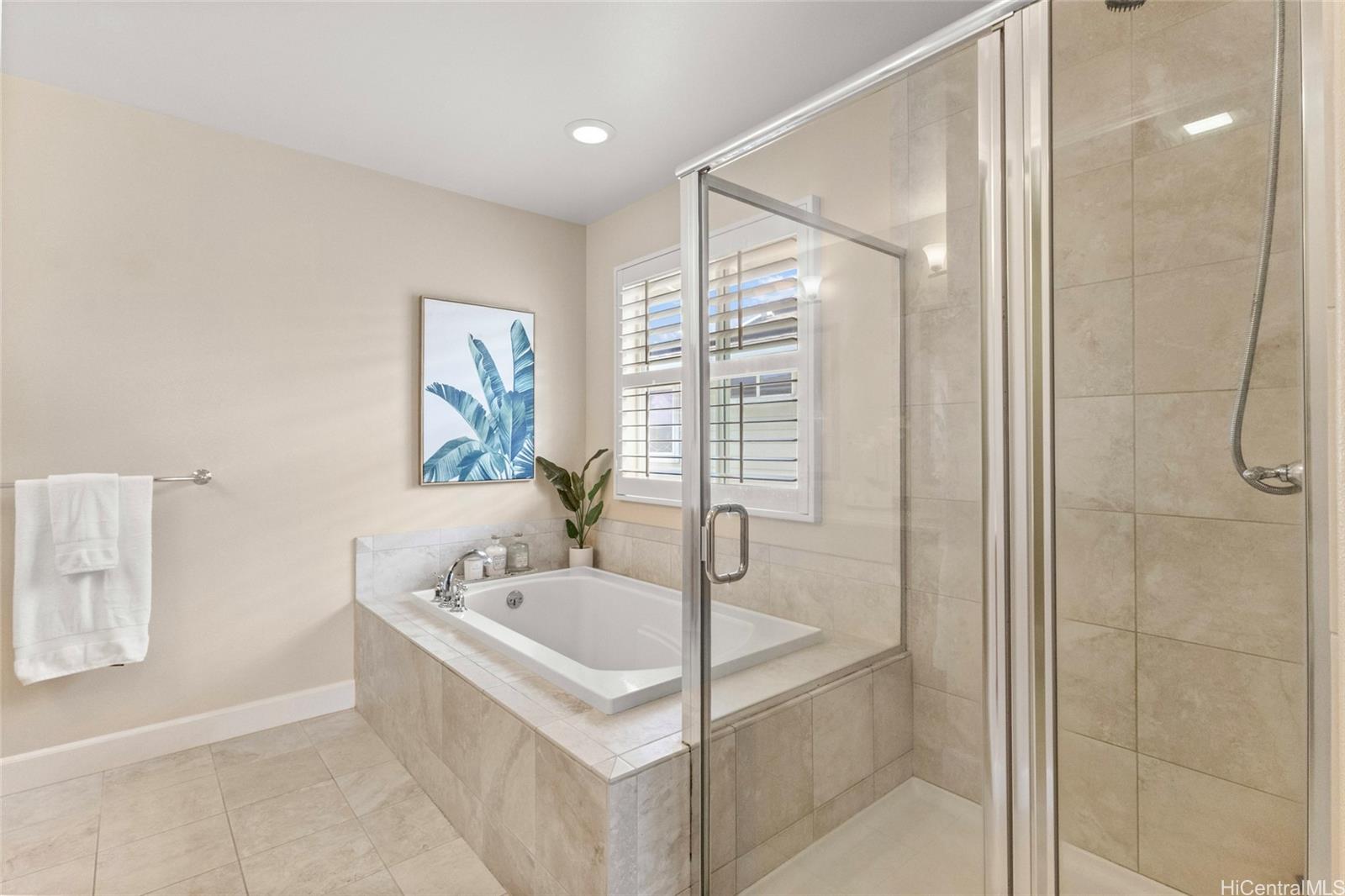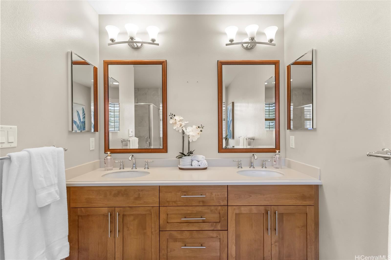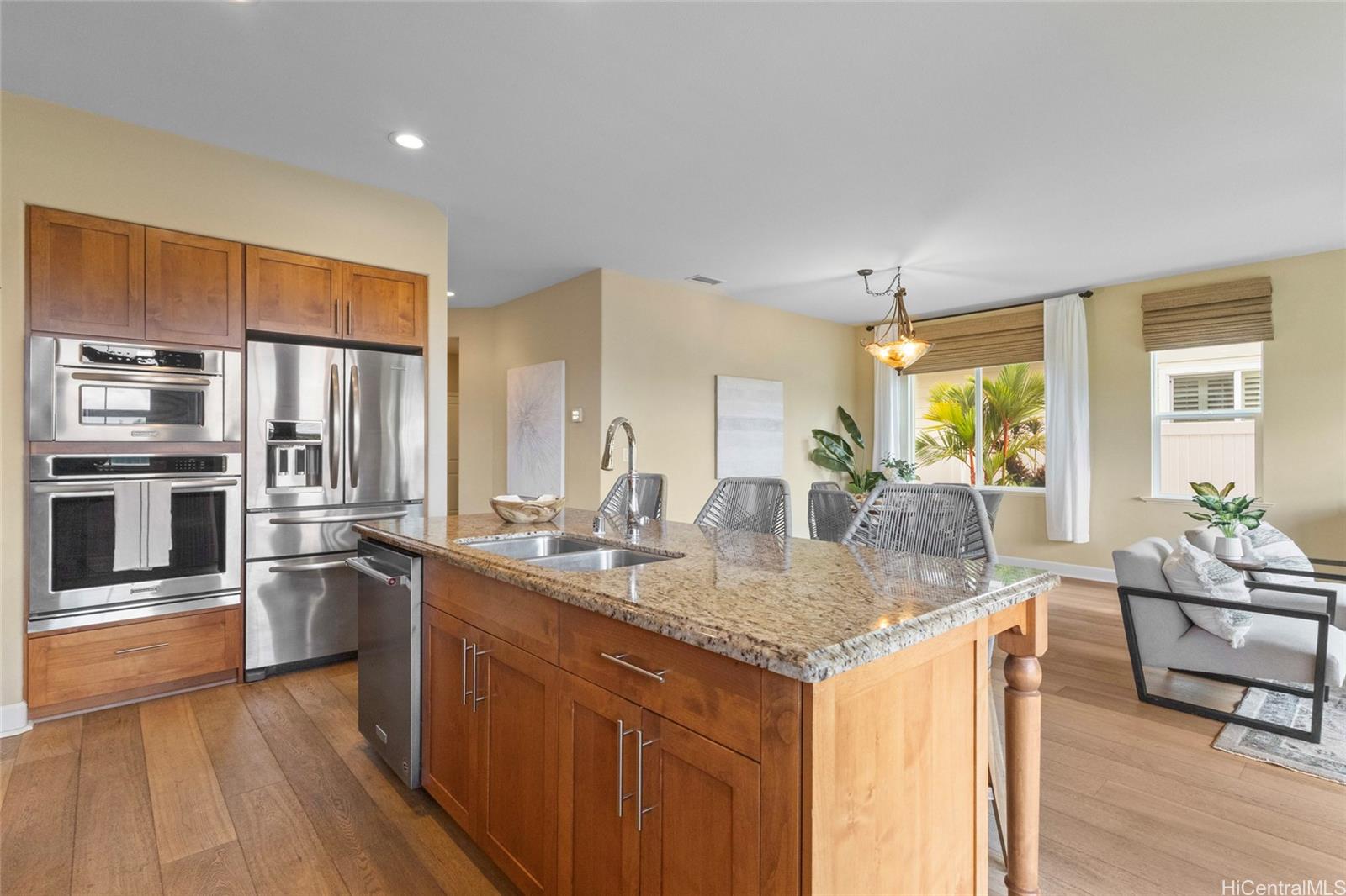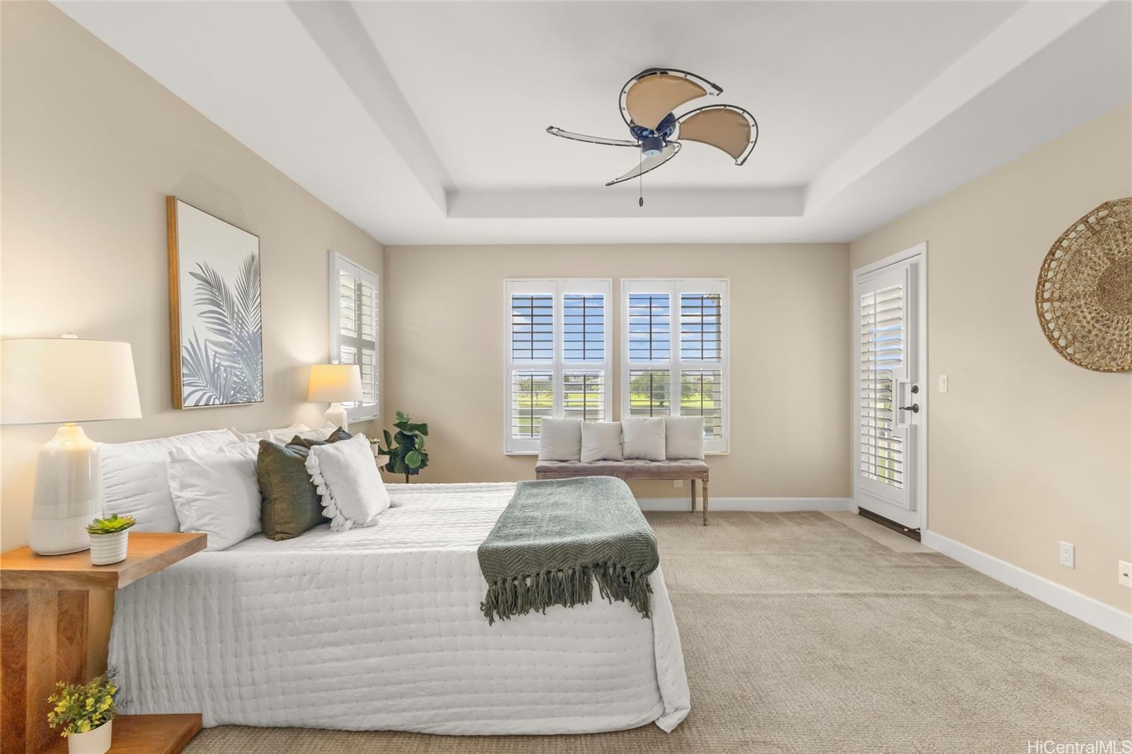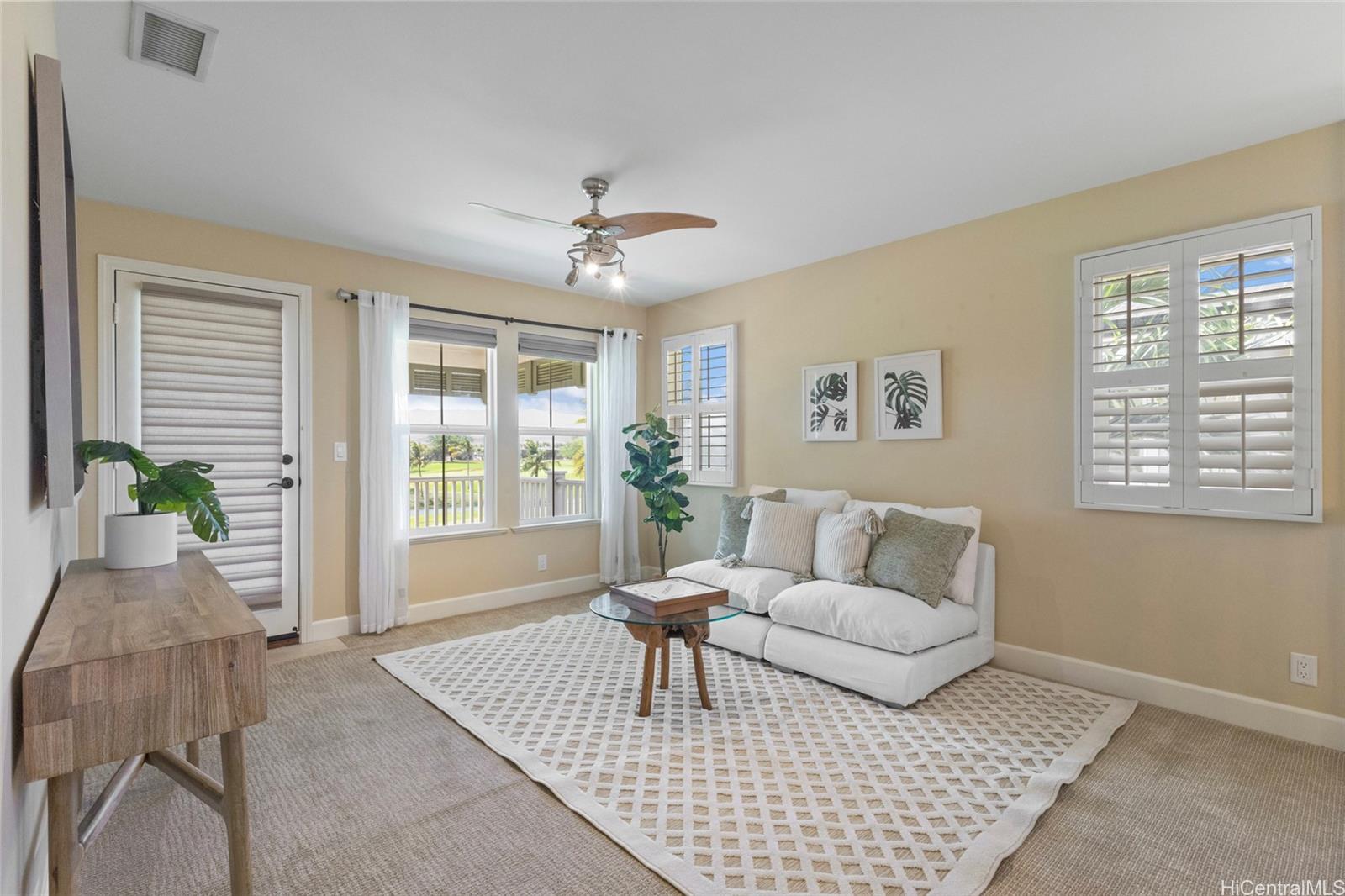 Now with Seller offering $20,000 Credit toward closing! Enjoy golf course views from this island oasis home. Overlooking the fairway of Hoakalei Country Club, this stunning 4 bed, 3 bath home offers an unmatched blend of comfort and island elegance. Its thoughtful design creates a seamless flow between indoor and outdoor living. The heart of the home is a modern, open-concept kitchen outfitted with granite countertops, stainless steel appliances and custom cabinetry. Just outside, the covered lanai leads to lush green space and a patio, featuring built in gas grills. Whether you’re preparing a meal or entertaining friends, this space is as functional as it is beautiful. The bedroom and full bath on the first floor provides convenience and ease of accessibility for guests or extended family. A versatile loft upstairs offers multiple use options — perfect for a home office, playroom, or media space. The primary suite boasts a private balcony with sweeping views of the golf course and Waianae mountain range just across the water, bringing the resort lifestyle right to your backyard.