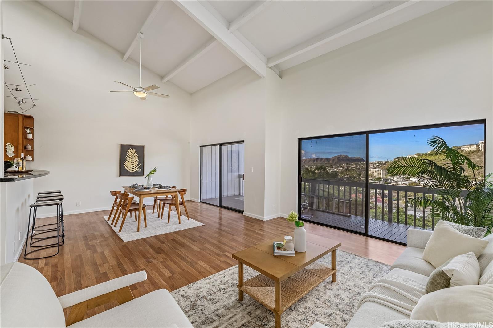 Rare find, a great buy! Welcome to Kahala View Estate, 4-bedroom (4th bedroom has no closets) , 2.5-bath split-level townhome offering spectacular Diamond Head, ocean, mountain, and city views. Perched above Kahala in a secure gated community, this residence combines privacy, convenience, and timeless island elegance.