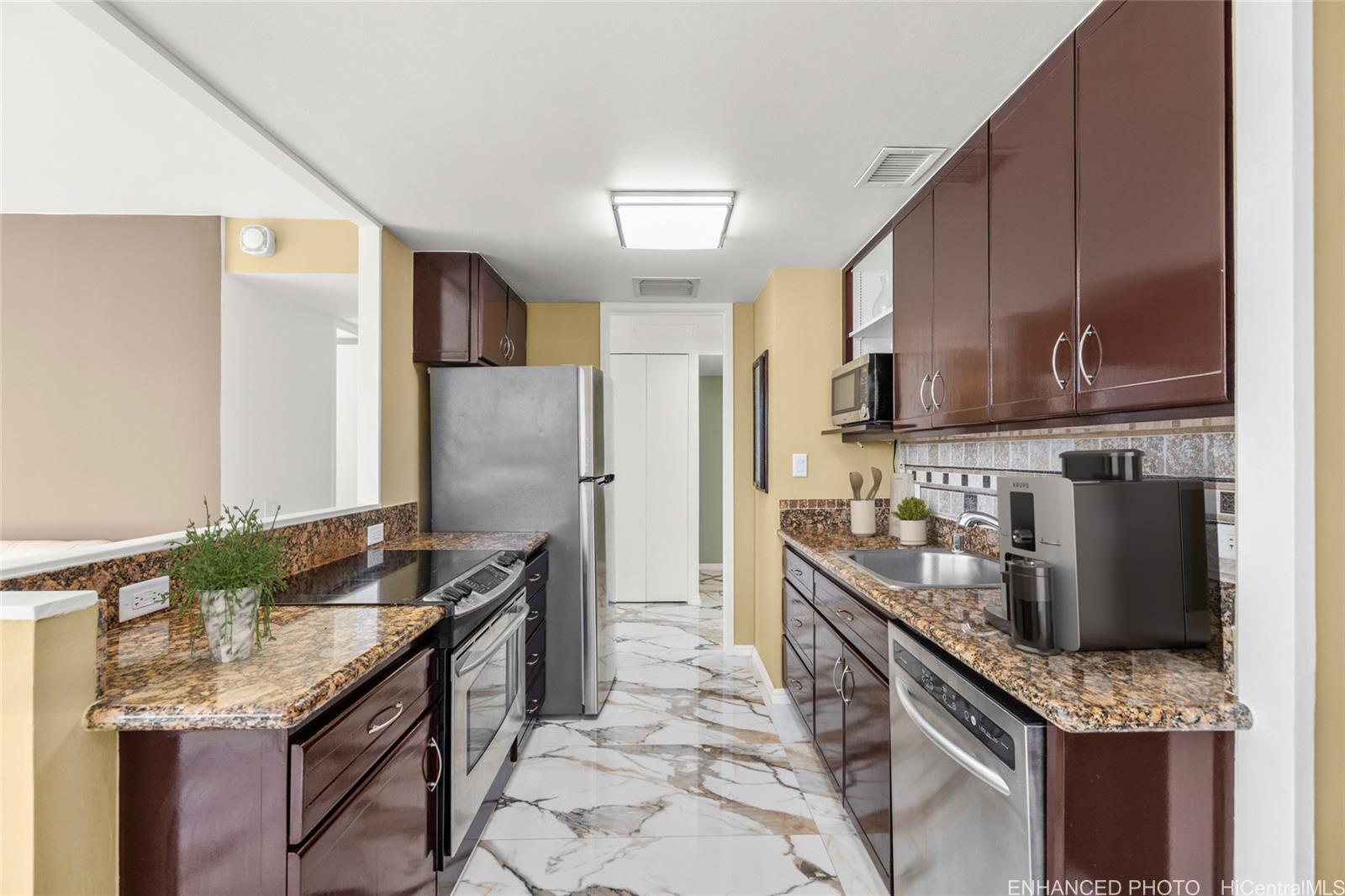 ハワイの首都の中心に位置する、ワンランク上の都会の優雅さへようこそ。高層階の角部屋レジデンスは、海、山、そして街の景色を堪能できます。床から天井まで届く大きな窓からは、息を呑むような日の出が眺められ、広々としたラナイへと続きます。活気あふれるホノルル・ダウンタウンを見下ろす、プライベートなサンクチュアリです。大理石の床、滑らかな天井、新しく塗装されたモダンな内装、花崗岩のカウンタートップとステンレス製の電化製品を備えたオープンキッチンなど、美しく改装された2ベッドルームの隠れ家は、島の静寂と時代を超えた洗練さを融合しています。セントラルエアコン、屋根付き駐車場、24時間体制のセキュリティ、そして電気、水道、下水道、ケーブルテレビ、インターネット接続料を含む管理費など、すべてが含まれています。ハーバースクエアには、改装済みのプールデッキ、常駐管理人、セキュリティゲート、駐輪場、ゴミ捨て場、同じ階の収納ロッカーなど、利便性の高い設備が備わっています。ホノルルの個性豊かなアート地区、シックなダイニング、ブティックマーケット、CU HI、ピクルス・アット・フォルテのピックルボール、DoHoナイトマーケット、そして州議事堂、イオラニ宮殿、アロハタワーといった建築物の魅力を探索しましょう。都会のアイランドライフの醍醐味を存分に味わえます!ホノルルで最も魅力的なコミュニティの一つで、美しく暮らし、自信を持って働き、そして無理なく成長しましょう。