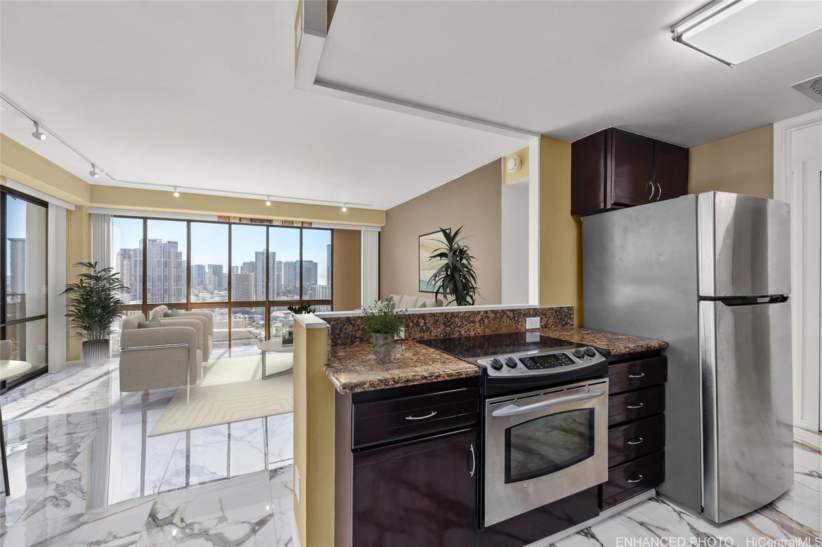 Welcome to elevated urban elegance in the heartbeat of Hawai‘i’s Capital City. This high-floor corner residence is wrapped in ocean, mountain & city views, framed by floor-to-ceiling windows that capture stunning sunrises & opens to an expansive lanai-your private sanctuary above vibrant Downtown Honolulu district. Beautifully updated with marble floors, smooth ceilings, newly painted, modern finishes, an open kitchen with granite countertops & stainless-steel appliances, this 2-bedroom retreat blends island serenity with timeless sophistication. Enjoy central A/C, covered parking, 24/7 security & maintenance fees that include it ALL: electricity, water, sewer, cable & internet. Harbor Square enhances convenience with a renovated pool deck, on-site manager, secure entry, bike storage, trash chute, and same-floor storage locker. Explore Honolulu’s eclectic art district, chic dining, boutique markets, CU HI, Pickles @ Forté pickleball, DoHo Night Market & architectural landmarks - State Capitol, Iolani Palace & Aloha Tower. This is urban island living at its most inspiring! Live beautifully, work confidently, and thrive effortlessly in one of Honolulu’s most captivating communities.