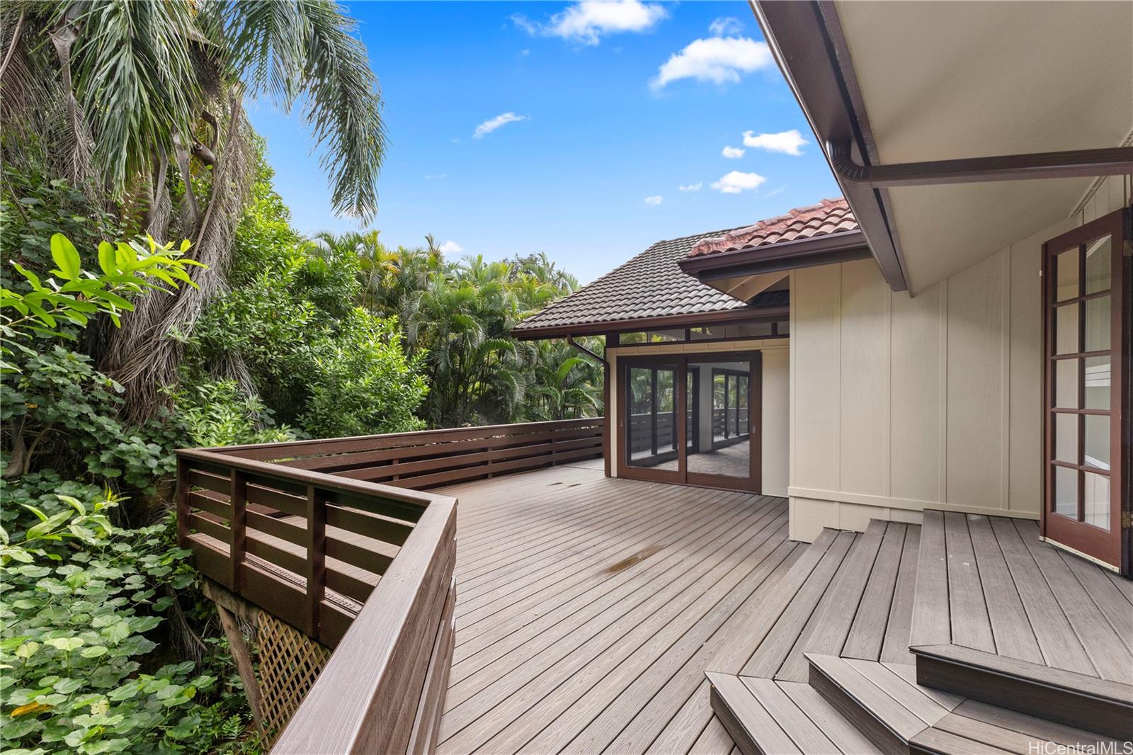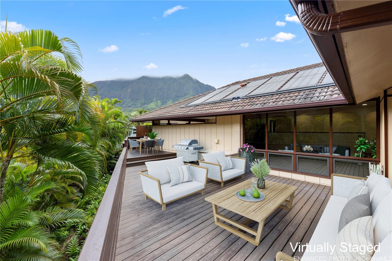 Discover a rare opportunity in the quiet Maunawili community, tucked against the majestic Ko'olau mountain range. This 3-bedroom, 2-bath home, with a bonus den, sits on an oversized 12,090 sq. ft. lot at the end of a cul-de-sac and features one of its most unique highlights—an indoor heated swimming pool in a screened-in lanai. Large windows and sliding doors open to an expansive wraparound deck overlooking lush tropical foliage, creating a peaceful, treehouse-like setting. The fenced outdoor space includes a small grassy area and mature plantings, while the elevated deck offers a private perch among the trees.