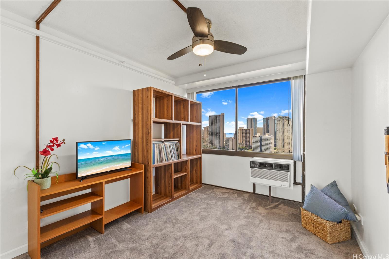Rarely available high floor ocean view fee simple 2 bedroom/2 bathroom with 2 COVERED SIDE BY SIDE PARKING STALLS! Featuring beautiful ocean, Waikiki and city views. Enjoy the Friday night fireworks and amazing sunsets from your spacious lanai. This upgraded unit offers an open concept kitchen, washer/dryer, extra storage, air conditioning, ceiling fans, newly tinted windows, new refrigerator and much more.