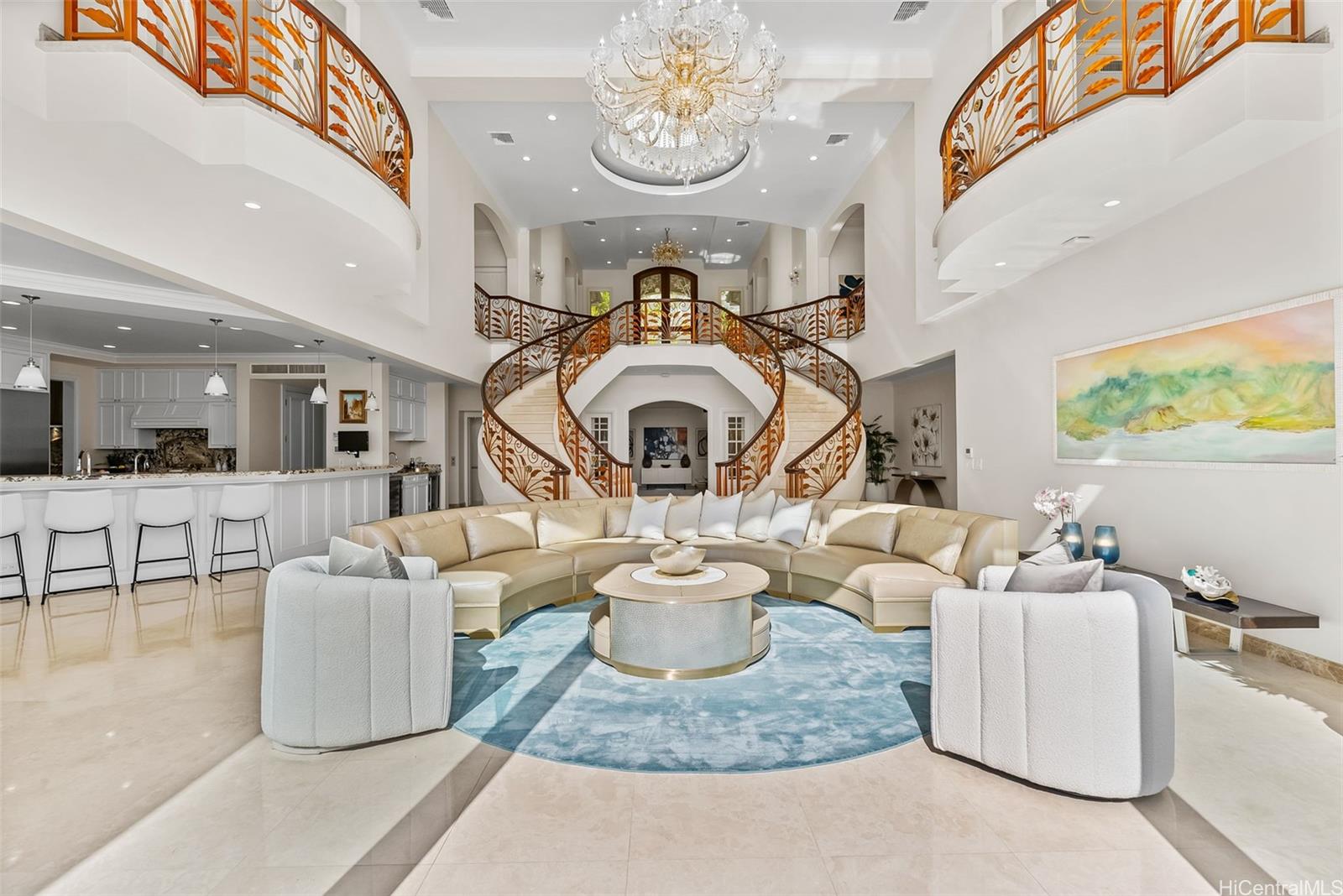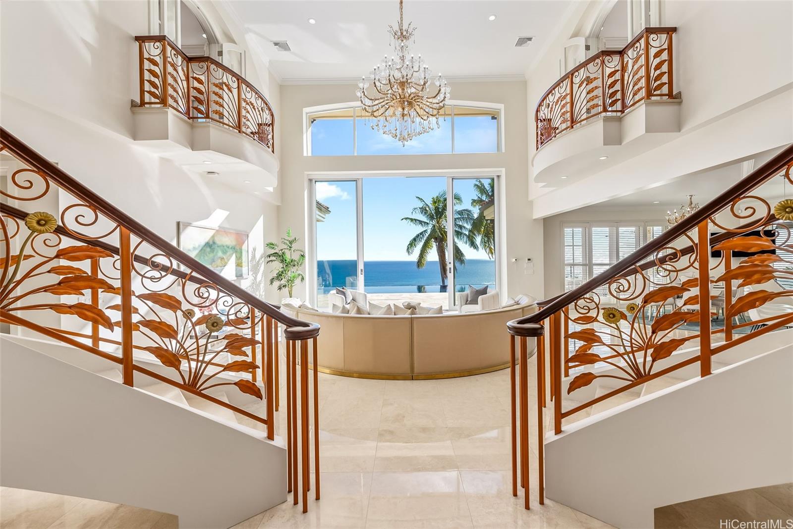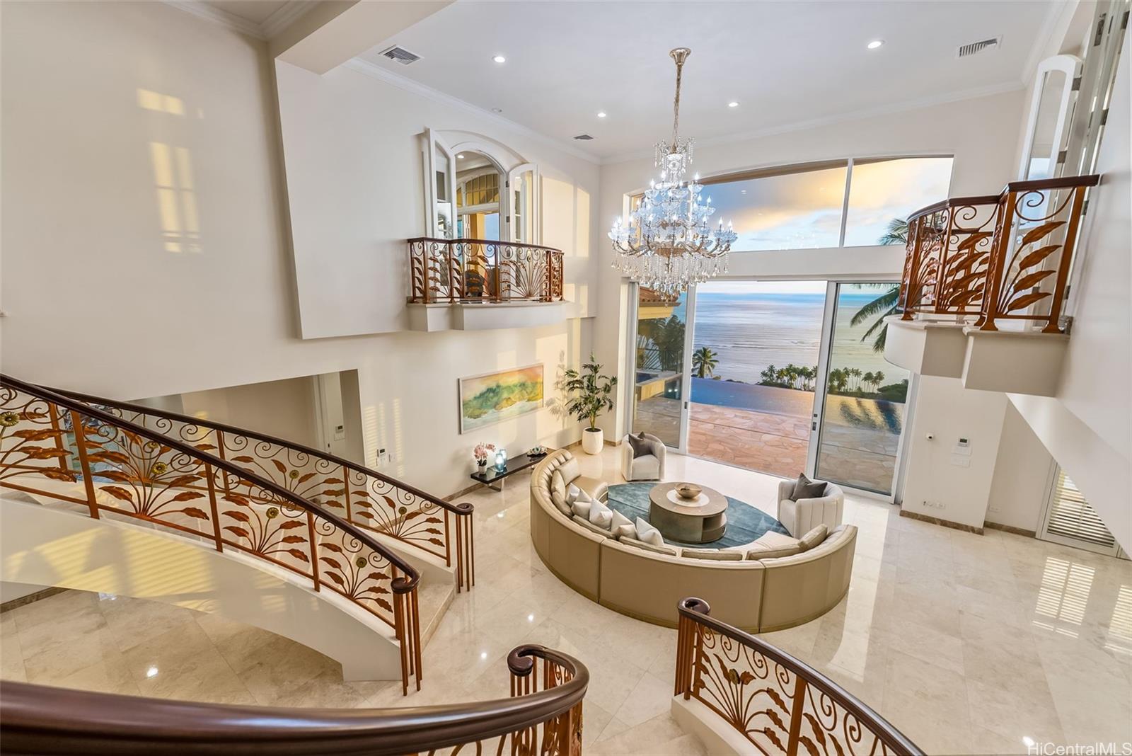 Boasting over 6,000 sq ft, the home showcases exceptional craftsmanship and luxurious finishes. A dramatic double staircase welcomes you into the expansive living room, where soaring ceilings and walls of glass frame the stunning views and open to the infinity-edge pool and expansive deck, ideal for outdoor dining, entertaining, and enjoying Hawaii’s iconic scenery.