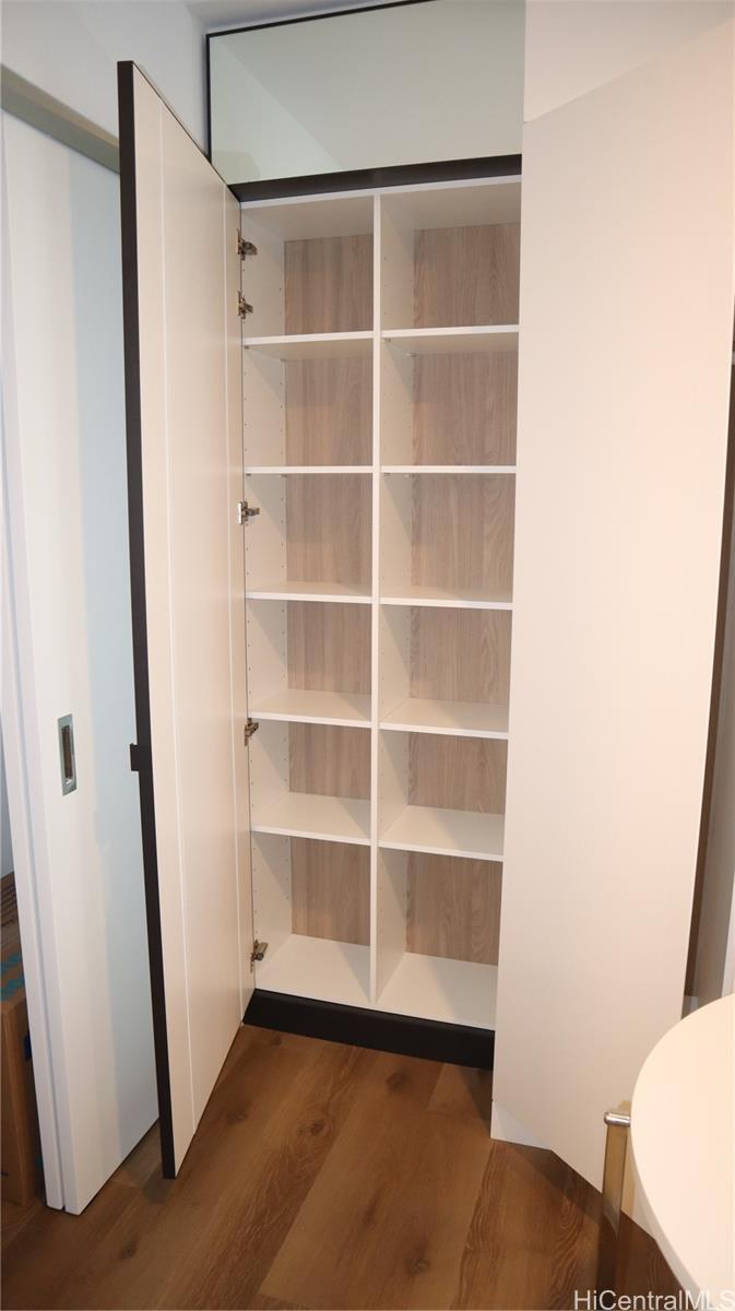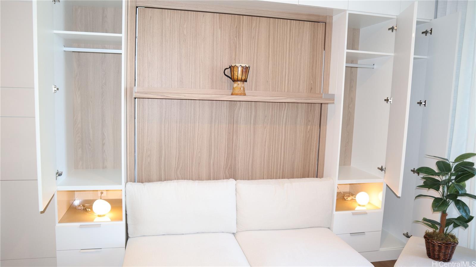 Live in this high floor fully furnished studio on the preferred cooler side of the building! This very well priced studio with a Queen size Murphy's bed, an attached sofa, a folding dining table, a built-in work center and closets, lots of storage, a furnished Lanai that's all blended in by renowned designer Lauren Rottet, to fit the complete and elegant decor. You can't forget the complete set of kitchen ware with cooking vessels, place settings, silverwares' and more. A central AC system will create a cool climate at your command. This unit is fully equipped for an instant and comfortable lifestyle! The amenities are Resort Style with a Fitness Center, a Yoga Room, a Pool Deck and Jacuzzis surrounded by Cabanas. You will enjoy the stunning ocean and city views from your private lanai as well as panoramic Views from the 42nd floor Sunset Sky Lounge. Just steps away you will find several culinary delights including Cino, Rinka, Onkee, Tonkatsu Kuro, Planted by La-Tour, Dean & DeLuca and more. You will be able to walk to the State's Flagship Whole Foods Market in a few very short minutes as well as the Saturday Kakaako Farmer's Market!