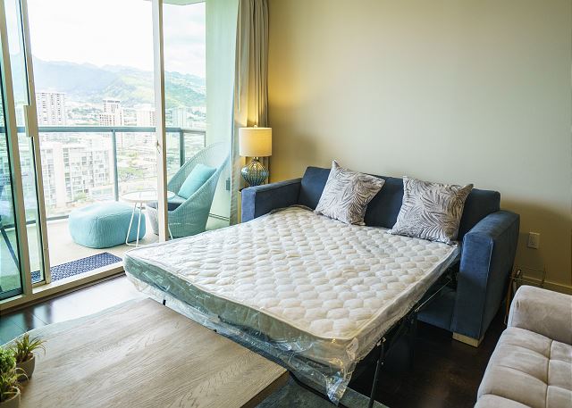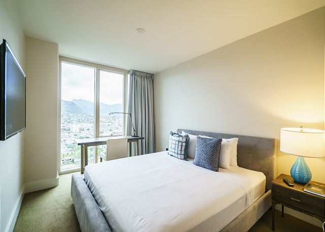 お部屋、バルコニーからの景色は素晴らしく、遠くマノアの山々が綺麗にご覧いただけます。夕方の時間帯にはかなりの確率で山にかかる綺麗な虹をご覧い頂けます。