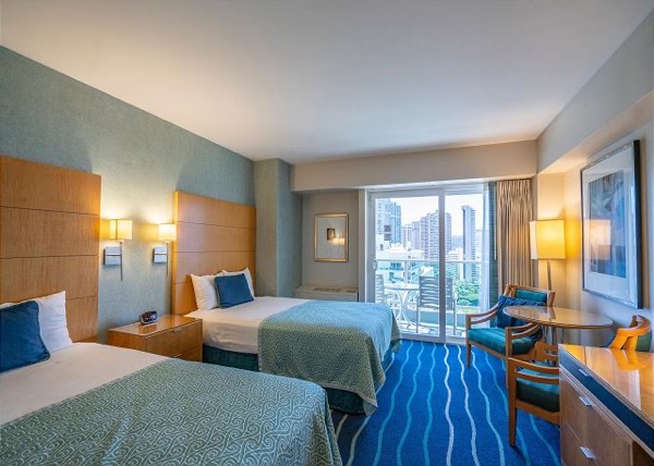 広々余裕たっぷりのホテルタイプのお部屋にダブルサイズのベッドが2つ。女子旅、男子旅、友達旅行にもお勧め!アラモアナショッピングセンターに直結の橋を渡って30秒で買い物天国。