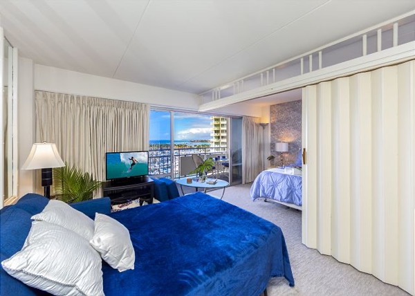 ハワイ5ーOの舞台で有名な「イリカイアパートメント」10階-ハーバービュー、最近改装されたばかり、お洒落なスタジオのお部屋。最大4人まで滞在可能!